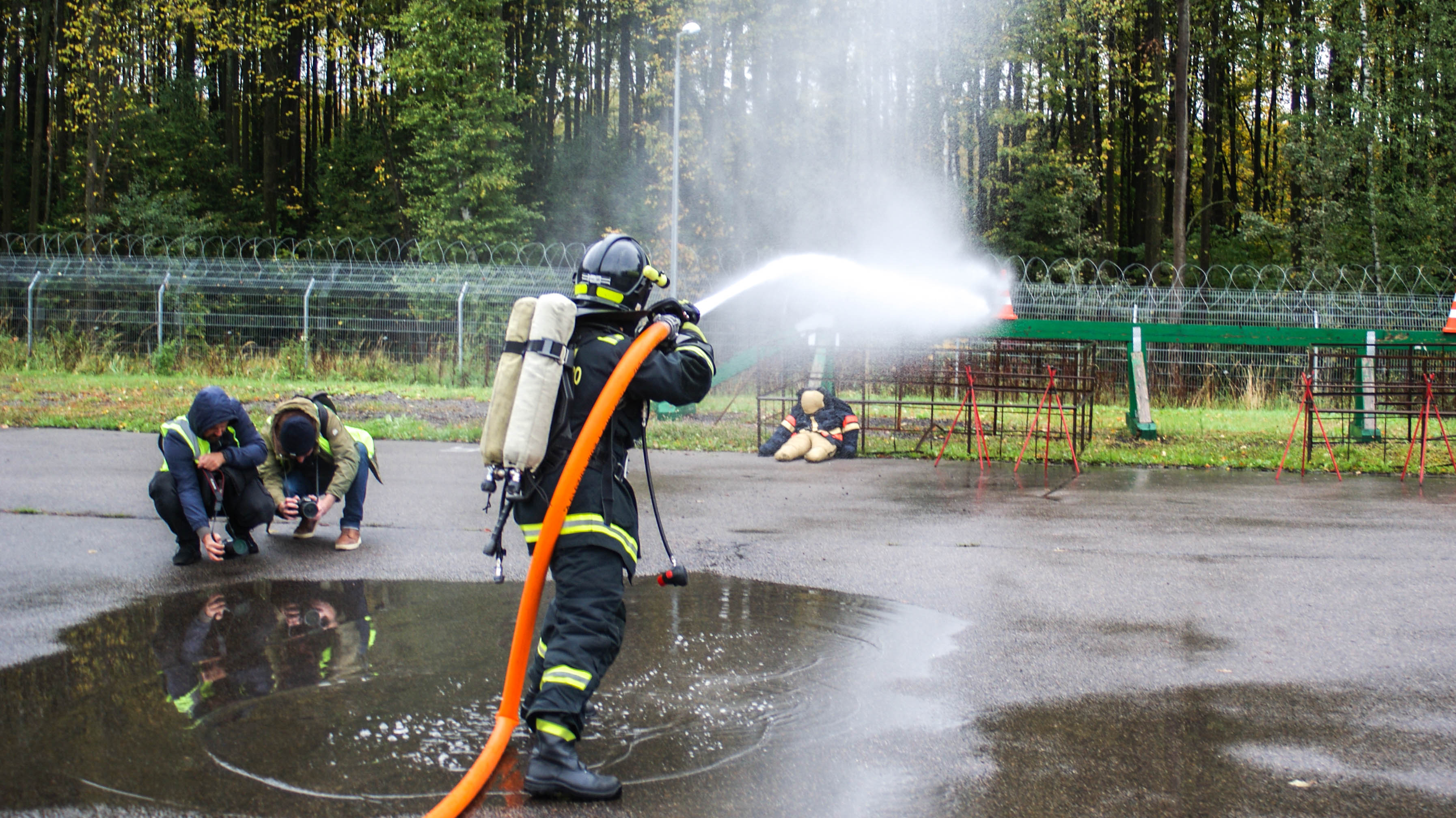 The practical part for rescuers included putting on protective suit and equipment, connecting fire hose to a fire truck and extinguishing a simulated fire, working with a rescue tool (hydraulic shears) and carrying a victim (dummy) for 15 meters to a stretcher. The average time to complete all stages of the competition was less than three minutes.
