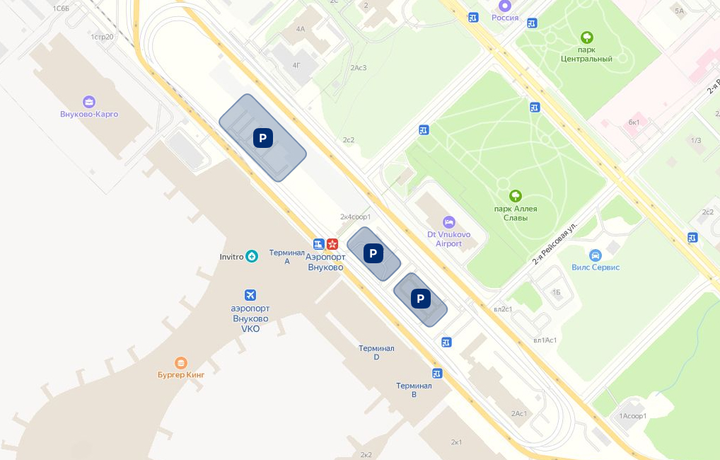 There are two multi-storey car parks in the Vnukovo Airport terminal square accommodating 350 parking spots each as well as an adjacent area that can accommodate another 200 cars. Parking time is unlimited. You can enter the Vnukovo Airport terminal square (Departures and Arrivals) free of charge for up to 15 minutes. If you need more time, leave your car in the car park. The Vnukovo Airport terminal square is a transport safety zone; parking of vehicles on the terminal square is prohibited.