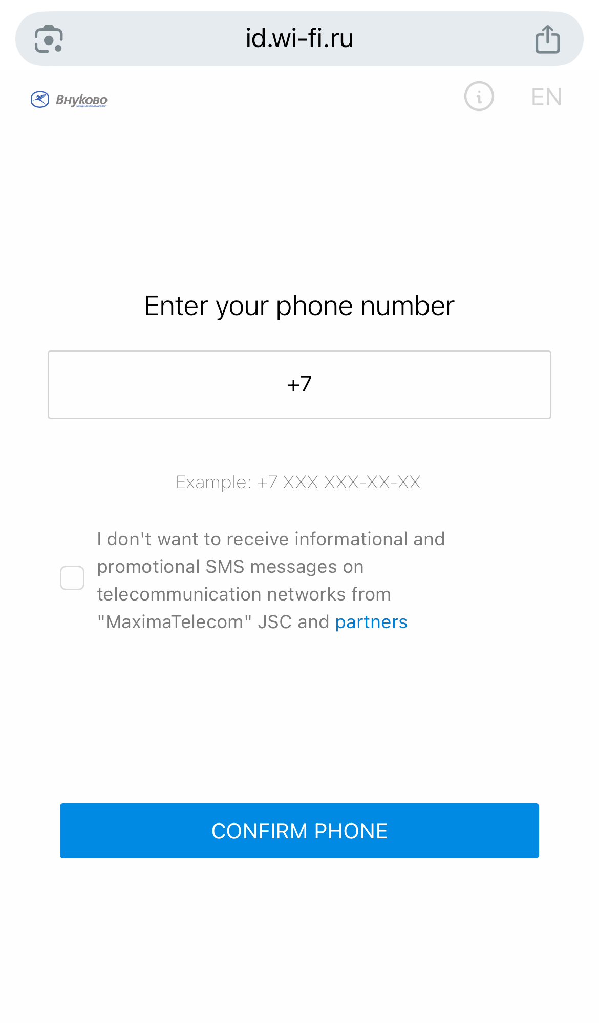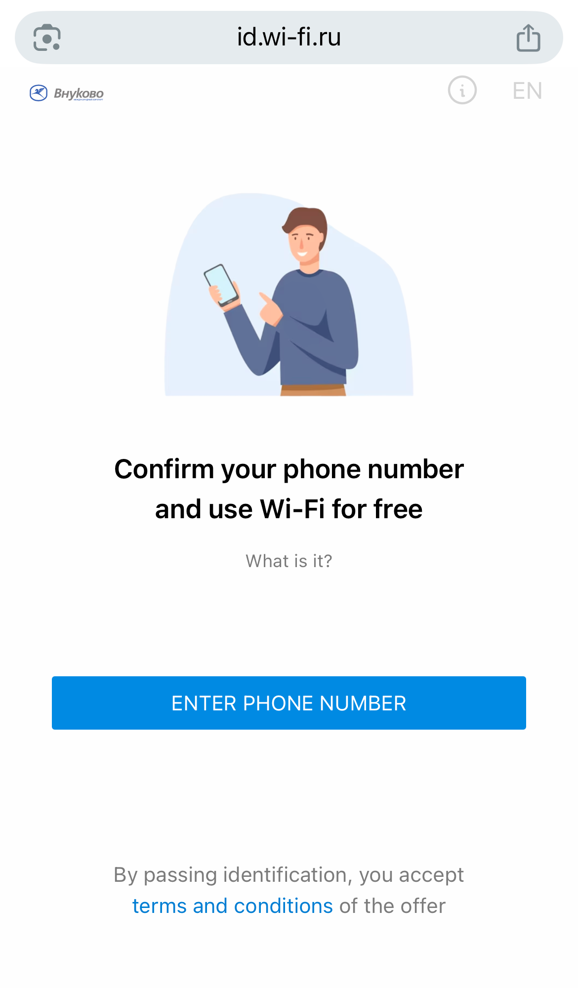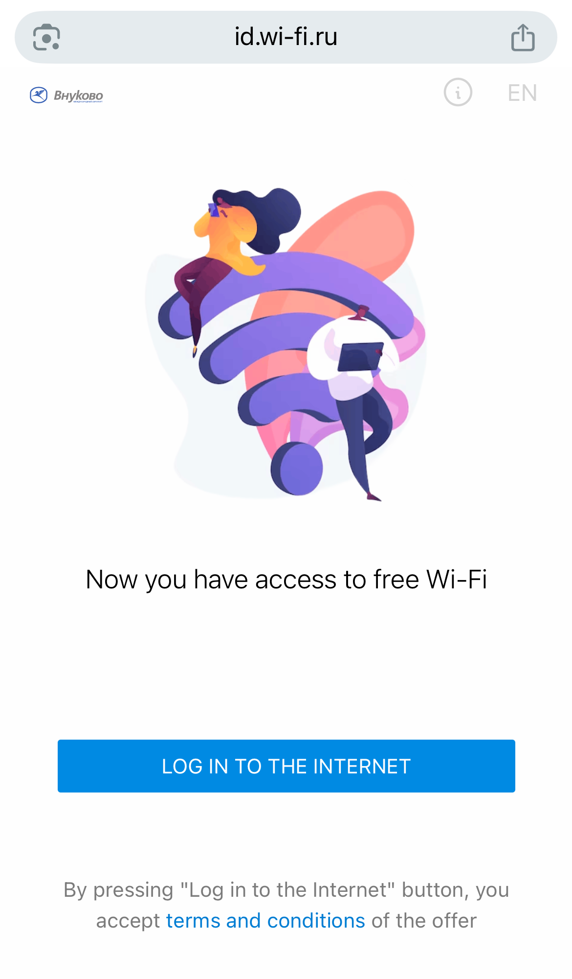 After the call, your number will be confirmed, and you will gain access to free internet. Click the «Log in to the internet» button.