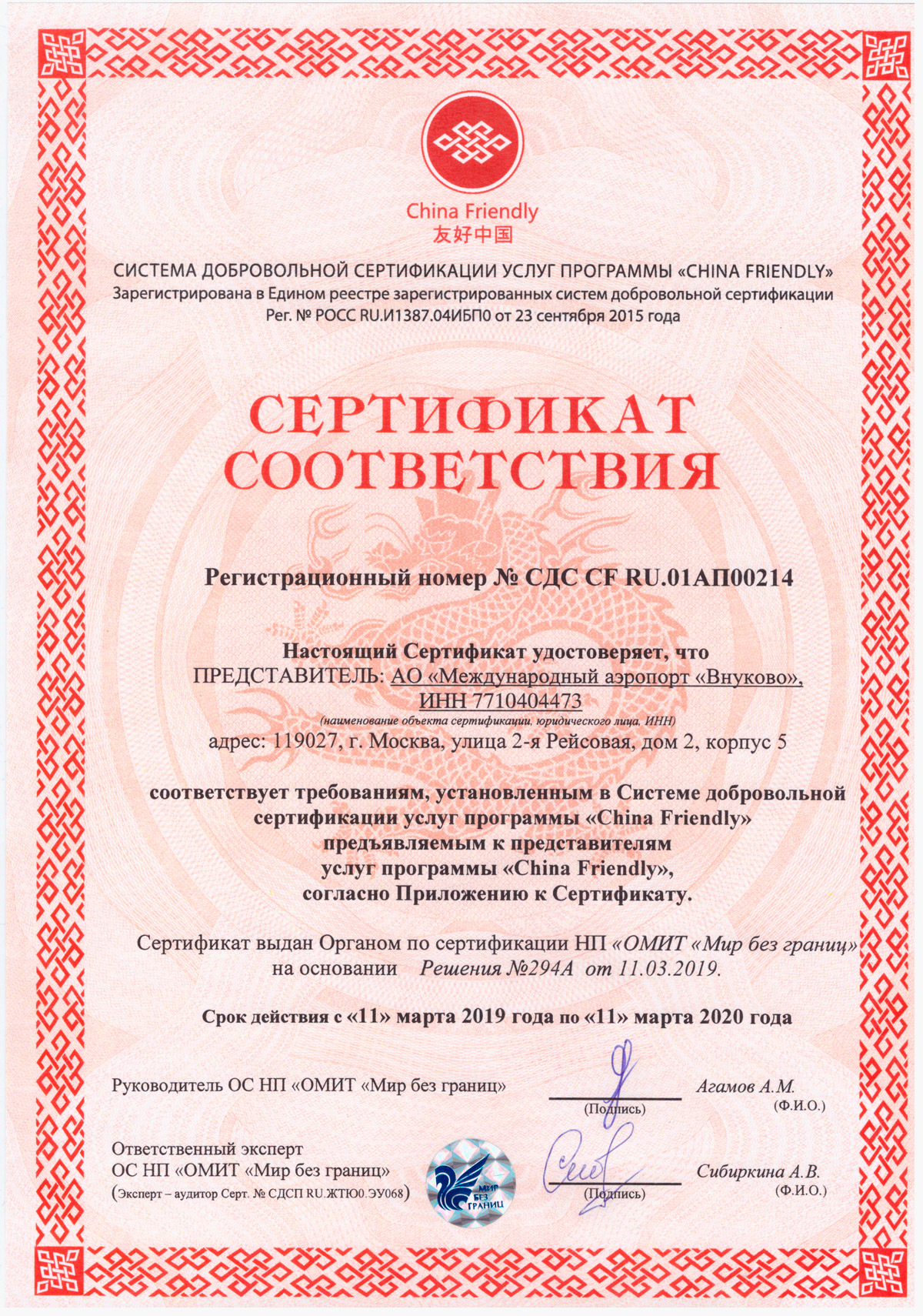 Международный аэропорт Внуково с 2019 года участвует в программе China Friendly, что подтверждено сертификатом соответствия. Главной целью этой программы является адаптация инфраструктуры и технологий обслуживания для китайских авиакомпаний и пассажиров.