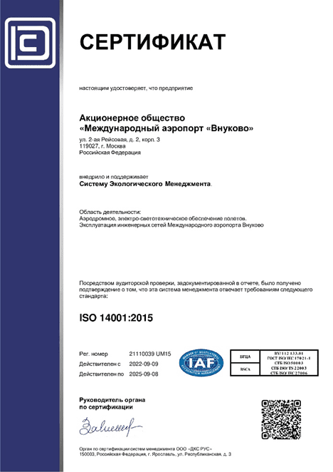 В августе 2025 г Международный аэропорт Внуково подтвердил соответствие системы экологического менеджмента требованиям международного стандарта ISO 14001:2015 и национального стандарта ГОСТ Р ИСО 14001-2016, успешно пройдя ресертификационный аудит.