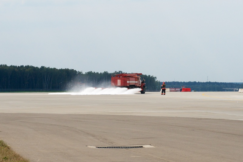 Основную часть программы учений составили мероприятия по развертыванию пожарных расчетов, тушению пожара, эвакуации пассажиров и экипажа, оказанию первой медицинской помощи пострадавшим.