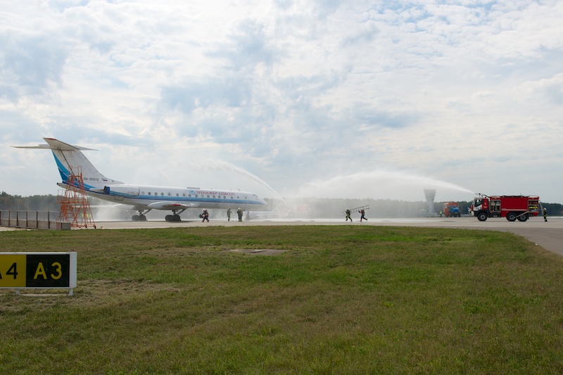 По сценарию учения самолет Ту-134 следует в аэропорт Внуково из Омска. На борту ВС 62 пассажира и 7 членов экипажа. За 15 минут до посадки командир воздушного судна докладывает о невыпуске передней стойки шасси и отказе гидросистемы. После чего руководитель полетов аэропорта установленным порядком объявляет «Тревогу» для расчетов аварийно-спасательной команды. На покрытие взлетно-посадочной полосы наносится воздушно-механическая пена. Экипаж выполняет аварийную посадку на пенную полосу с невыпущенной передней стойки шасси. При посадке происходит возгорание носовой части фюзеляжа в районе передней стойки шасси, возникает осложнение авиационного события. В конце пробега ВС происходит разрушение колес левой основной стойки шасси. По докладу командира ВС среди пассажиров возможно наличие пострадавших, имеется угроза проникновения пожара в кабину экипажа и распространения его в салон самолета. В аэропорту вводится ограничение в воздушном движении и пожарно-спасательный расчет СПАСОП сразу после полной остановки ВС приступают к спасанию людей и тушению пожара. Звено газодымозащитной группы через аварийные люки проникает в салон и эвакуирует пассажиров.