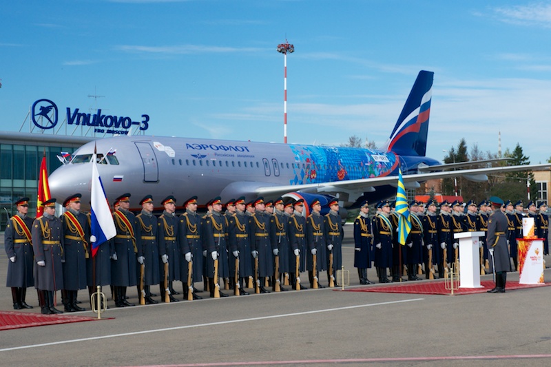В столичный аэропорт Внуково Олимпийский огонь доставил рейс SU 7101, выполненный техническим Партнером Эстафеты — авиакомпанией «Аэрофлот». Лампада с огнем летела на последнем ряду в салоне экономического класса, специально оборудованного для необычного «пассажира». У трапа специальный рейс «Афины — Москва» встречала рота Почетного караула. Под звуки военного оркестра лампаду с Олимпийским огнем «Сочи 2014» из самолета вынесла шестикратная олимпийская чемпионка Лидия Скобликова.