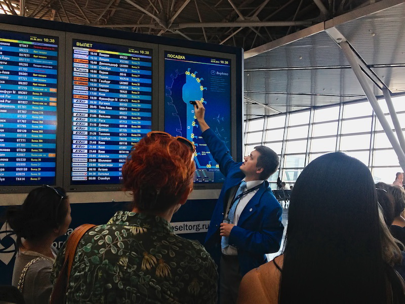После прохождения трансфера и процедуры досмотра, участники экскурсии переместились в сектор международных рейсов, где им рассказали об истории и развитии аэропорта Внуково, особенностях его структуры и конкурентных преимуществах.