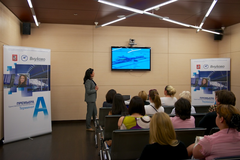 Экскурсия началась с осмотра зала обслуживания пассажиров бизнес-класса и VIP-зала, также гости осмотрели офис авиакомпании «Трансаэро» в офисной зоне на верхнем уровне терминала, после чего для участников мероприятия была проведена презентация на тему «Конкурентные преимущества аэропорта Внуково».