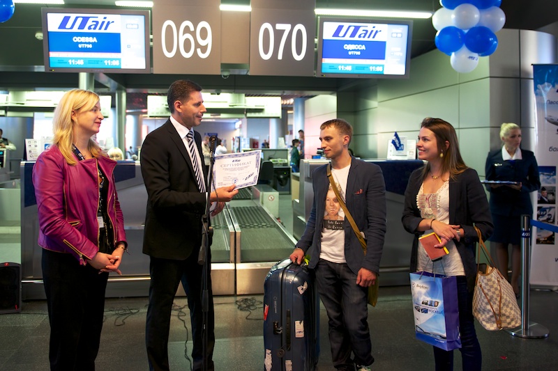 Всех пассажир первого рейса авиакомпании «ЮТэйр» в Одессу на стойках регистрации ждали памятные сувениры.