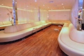 Легкий элемент авангарда в дизайн интерьера вносит отделка мебели: матово-золотистая в бизнес зоне и «крокодиловая кожа» в специальном пространстве для отдыха. Необычная подсветка в обеденной зоне меняется в зависимости от времени суток. Каминная комната для отдыха с удобными креслами и пуфами для ног придает пространству ощущение уюта.