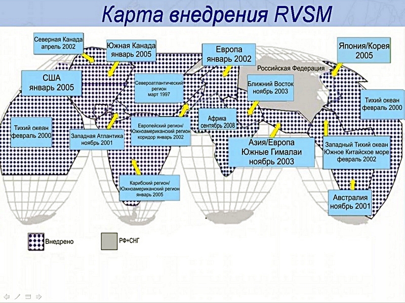 Одновременно с Россией RVSM вводится в воздушном пространстве Монголии, Казахстана, Кыргызстана, Таджикистана, Туркмении и Узбекистана. Таким образом, с вводом данной системы вертикального эшелонирования завершается начатая ИКАО в 1995 г. концепция внедрения RVSM, после чего воздушное пространство Земного шара будет находиться в единой системе эшелонирования RVSM.