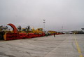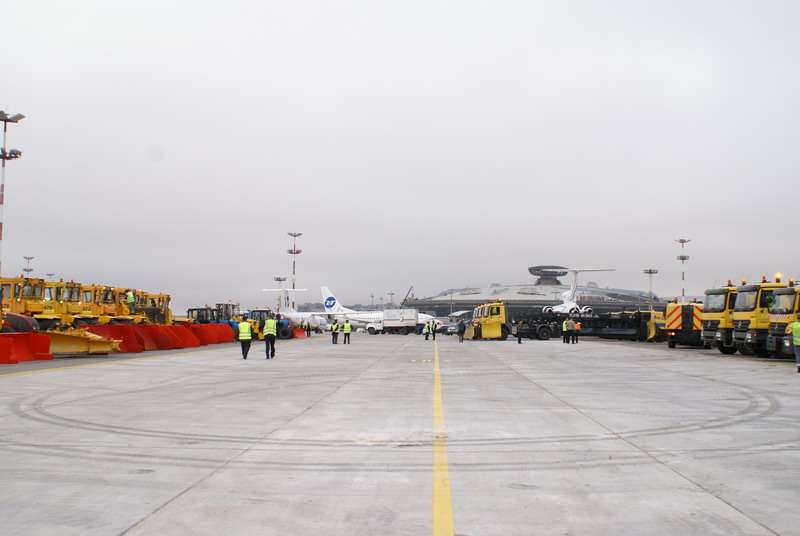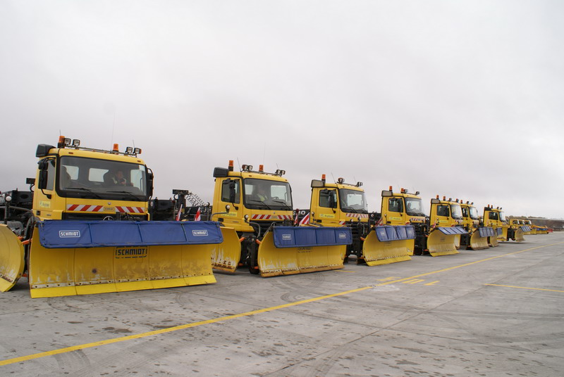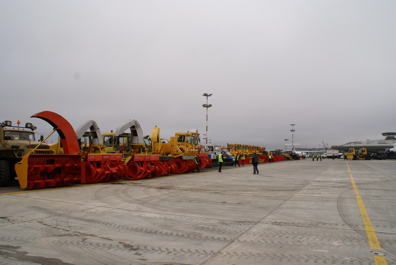 - Для очистки взлетно-посадочной полосы от снега и льда обычно используется колонна из семи подметально-уборочных спецмашин, которые оборудованы щеткой, механизмом для обдува и отвалом шириной 7,5 метра. Поскольку отвал крепится на передней части машины и ставится при движении под углом, очищаемая полоса покрытия за машиной составляет 5,5 метра. Семь машин встают уступом с небольшим перехлестом и за один круговой проход очищают всю полосу. На эту операцию требуется порядка 12 минут. В качестве резерва на случай выхода машины из строя, а также на время дозаправки, проведения ТО и других регламентных работ используются машины, которые обычно очищают от снега перрон. Сейчас этой технике по 5-6 лет, а рекомендуемый срок эксплуатации – 10-12 лет. Так что запас прочности у них еще большой. Машины в хорошем техническом состоянии.