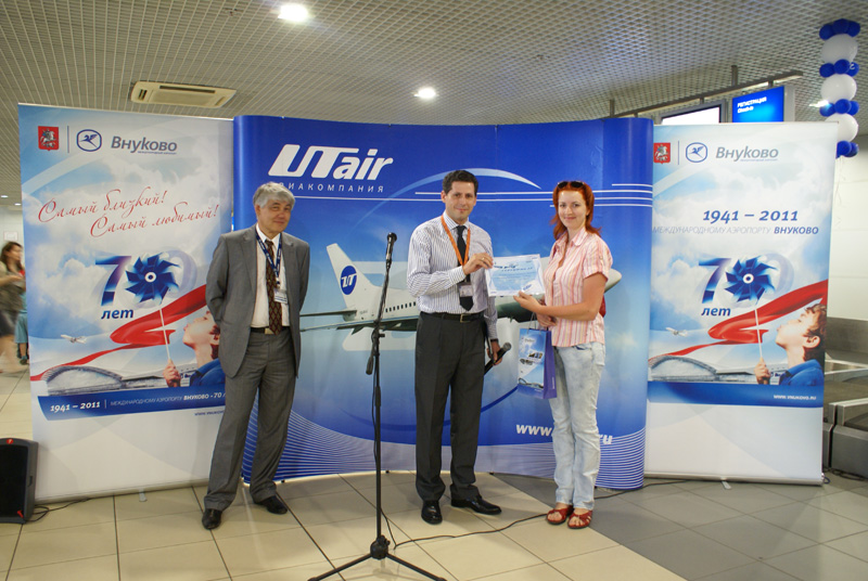 «Сегодня я лечу в Брно к подруге с праздничным настроением – она выходит замуж, а аэропорт Внуково и авиакомпания «ЮТэйр» сделали это событие вдвойне приятным. Спасибо Вам!» - сказала Елена после вручения ей ценных призов от аэропорта и авиакомпании: ваучер на пребывание в зале первого и бизнес класса и сертификат, который дает право перелета «туда-обратно» на любом регулярном рейсе маршрутной сети «ЮТэйр».