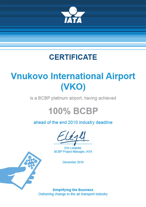 В течение 2010 года в аэропорту Внуково была произведена замена всего необходимого оборудования, которое дает возможность использовать двухмерные бар-коды. Все установленное оборудование полностью соответствует не только требованиям BCBP, но и сертифицировано под платформу общего доступа CUTE.