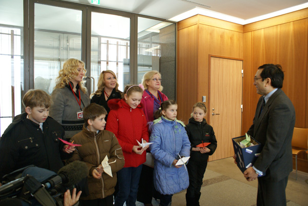 Узнав об этой традиции, воспитанники детского дома «Молодая гвардия» не смогли остаться в стороне от чужой беды и решили, во что бы то ни стало, поддержать детей из страны восходящего солнца, на долю которых выпали такие страшные испытания. Они своими руками сделали больше сотни бумажных журавликов с добрыми пожеланиями на английском и русском языках, и обратились в аэропорт Внуково, который уже длительное время опекает детский дом, с просьбой помочь им передать символы сочувствия и поддержки пострадавшим японским малышам. Полномочный Министр, заместитель Главы Миссии посольства Японии в РФ, господин Кэидзи Идэ с готовностью откликнулся на просьбу и принял делегацию детей и представителей аэропорта в здании посольства в Грохольском переулке.