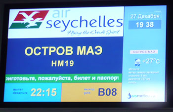 Вылет из Маэ в 12:10 по местному времени, прибытие во Внуково в 20:15 мск. Вылет из Внуково в 22:15 мск, прибытие на Маэ в воскресенье в 08:00 по местному времени.