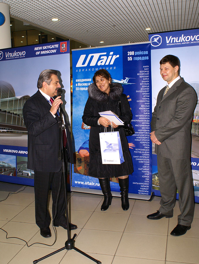 Перед началом регистрации на первый рейс Москва – Баку в терминале международных авиалиний аэропорта Внуково состоялась торжественная церемония, в которой приняли участие руководители аэропортового комплекса и авиакомпании. Первым зарегистрировавшимся на рейс пассажиром стала Айнур Мехтиева. От авиакомпании ей были вручены памятные подарки и сертификат на бесплатный перелет «туда-обратно» по любому направлению UTair. От аэропорта Внуково Айнур Мехтиева получила сувениры и ваучер на бесплатное обслуживание в бизнес-зале. Подарки от авиакомпании также были вручены всем пассажирам первого рейса в Баку.