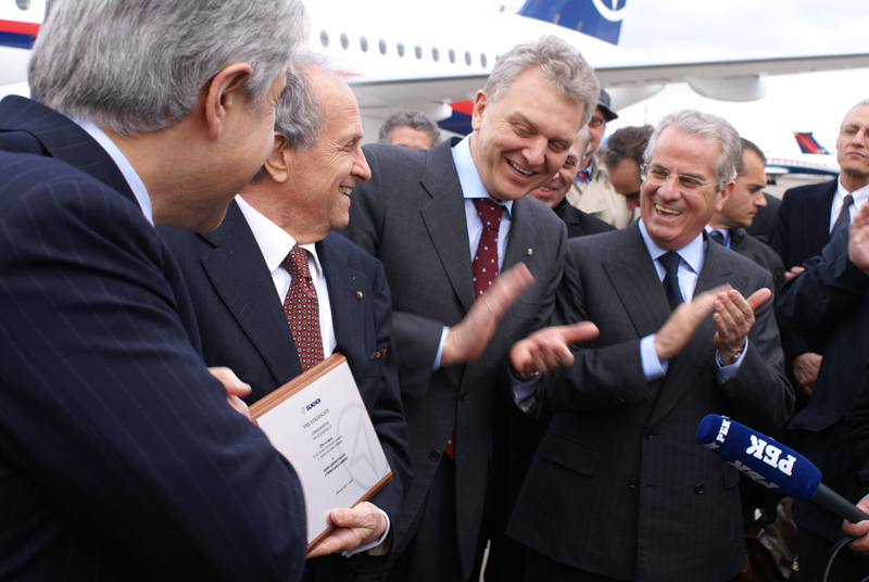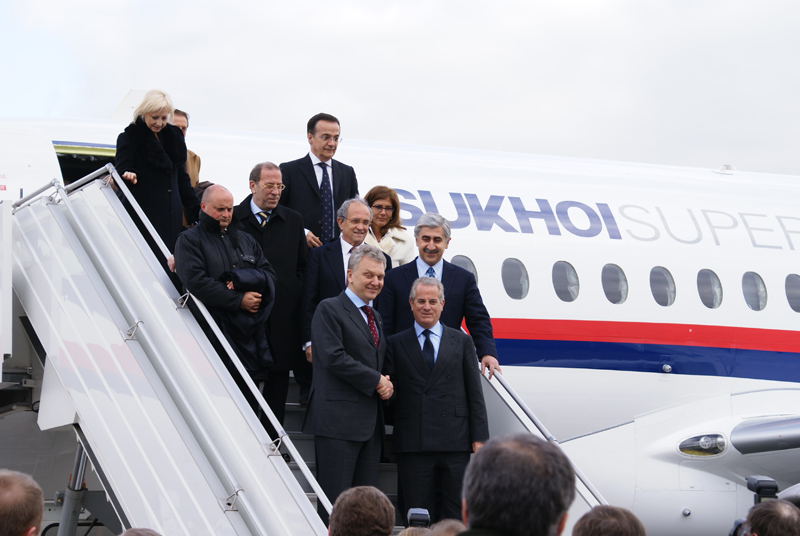 В тот же день, 7 апреля 2009 года, в Центре бизнес-авиации, входящего в состав внуковского аэропортового комплекса, прошла официальная церемония подписания соглашения о покупке части уставного капитала российской компании «Гражданские самолеты Сухого» (ГСС) итальянской фирмой Alenia Aeronautica. В церемонии приняли участие министр промышленности и торговли РФ Виктор Христенко, министр экономического развития Италии Клаудио Скайола, генеральный директор компании «Сухой» Михаил Погосян и президент итальянского машиностроительного холдинга Finmeccanica (владеет Alenia Aeronautica) Пьер Франческо Гуаргуальини.