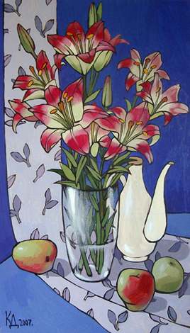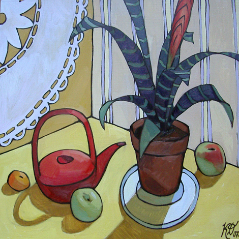 Художница изображает, казалось бы, простые вещи: старый телефон, кактус на подоконнике, горшочки с цветами, фрукты в тарелках. Под ее кистью эти предметы оживают, приобретая свой характер, усиливая цвет, изменяя форму. Позитивный настрой работ, созданных с юмором и легкой иронией, напоминает очаровательные иллюстрации из хороших книг, когда-то прочитанных в детстве.
