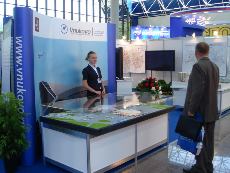 На стенде аэропорта Внуково представлена полная информация об аэропортовом комплексе и планах его развития. В частности, в рамках реализации проекта в этом году предполагается завершить возведение нового почтово-грузового комплекса площадью 57 тыс. кв. м, ввести в эксплуатацию новый командно-диспетчерский пункт и открыть после реконструкции взлетно-посадочную полосу №2. В течение двух лет на привокзальной площади будет построена десятиэтажная гостиница площадью более 30 тыс. кв. м на 439 номеров.