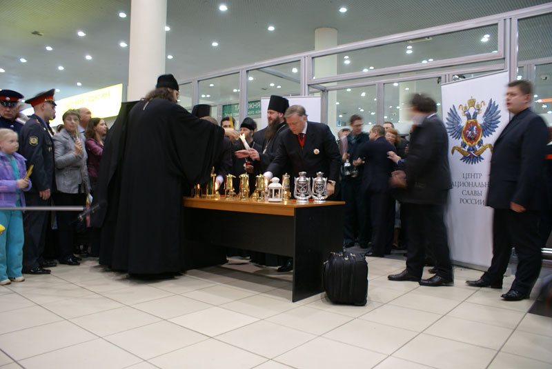 Делегацию, которая доставила огонь, возглавили председатель попечительского совета Фонда Андрея Первозванного Владимир Якунин и викарий Московского патриарха епископ Красногорский Савва. В состав делегации также вошли министр культуры и массовых коммуникаций РФ Александр Соколов, заместитель председателя Совета Федерации Светлана Орлова, вице-спикер Госдумы Любовь Слиска, губернатор Тульской области Вячеслав Дудка, президент Олимпийского комитета России Леонид Тягачев, писатель Валентин Распутин, президент ФАП, сенатор Сергей Щеблыгин, директор Эрмитажа Михаил Пиотровский.