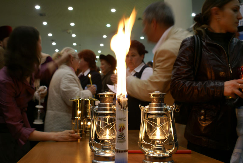 В зале прилета международного терминала аэропорта Внуково от частицы Благодатного огня были зажжены лампады, которые затем специальным кортежем были отправлены в храм Христа Спасителя к патриаршему пасхальному богослужению.