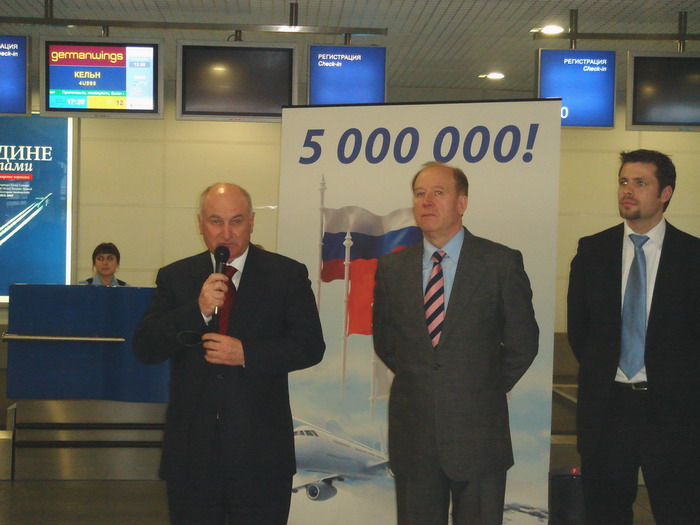 Пятимиллионным пассажиром аэропорта Внуково стал российский бизнесмен Вениамин Артамонов, вылетавший рейсом Москва – Кёльн авиакомпании Germanwings. Ему были вручены памятные подарки от аэропорта Внуково – цифровой фотоаппарат и ваучер на обслуживание в бизнес-зале международного пассажирского терминала Внуково.