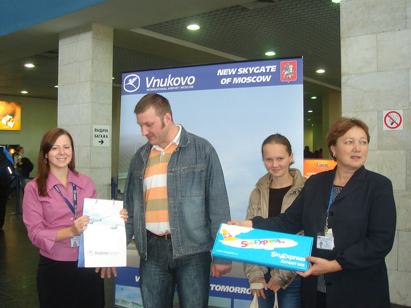 В этот день поздравления звучали и в адрес пассажиров, вылетавших первым рейсом «Скай Экспресс» Екатеринбург – Москва. По прибытии в Москву в зале прилета терминала внутренних линий аэропорта Внуково памятные подарки от авиакомпании «Скай Экспресс» и аэропорта Внуково были вручены жителю Екатеринбурга Петру Михайлову – первому пассажиру, забронировавшему билет на этот рейс.
