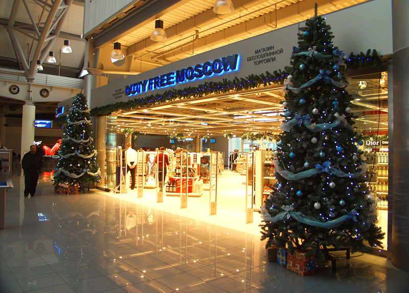 В терминалах аэровокзального комплекса развешаны поздравительные плакаты, красочные новогодние игрушки, установлены надувные с подсветкой фигуры Деда Мороза, празднично оформлены гирляндами и мишурой витрины магазинов и кафе.