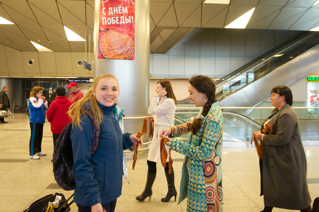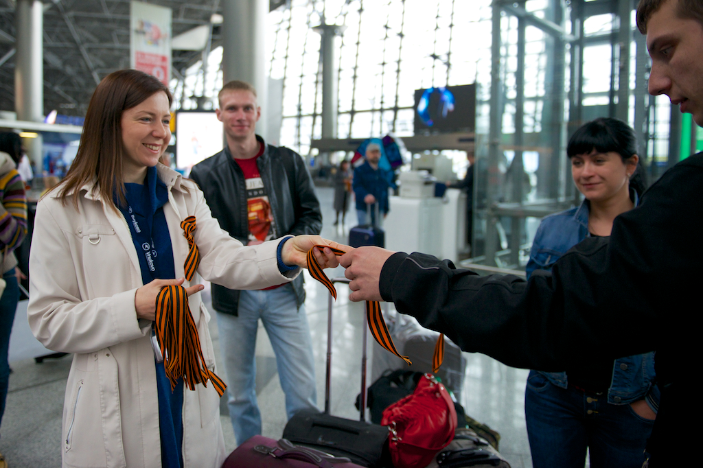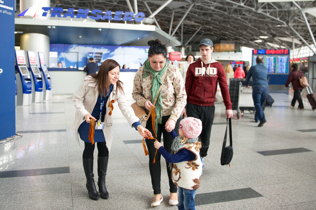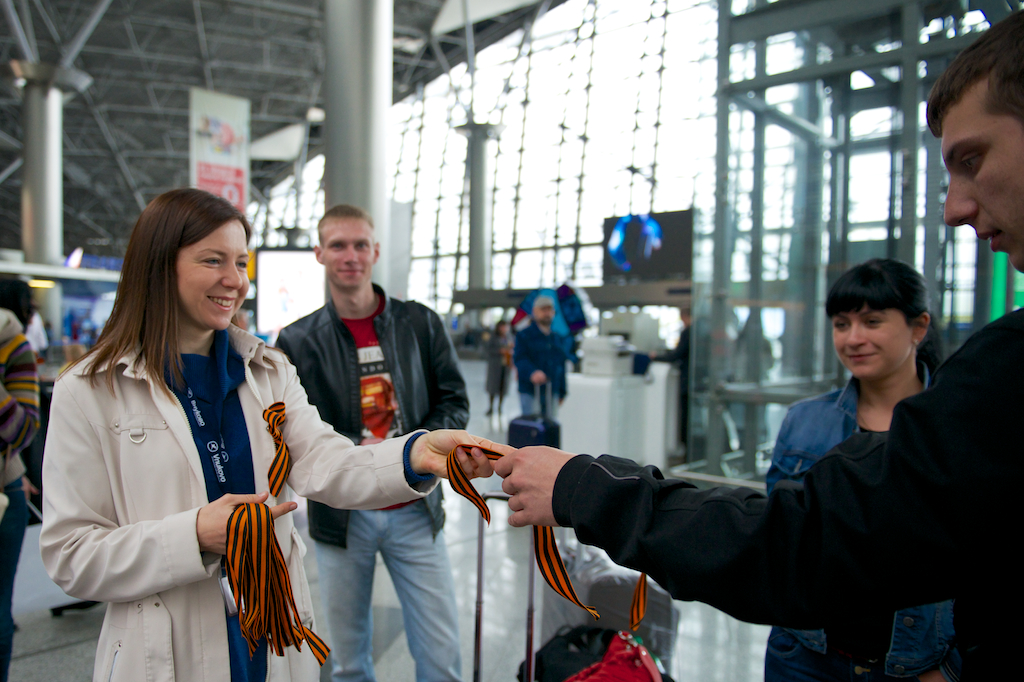 6 мая все желающие могут получить в аэропорту символ Дня Победы — Георгиевскую ленту. Кроме того, ленточку можно получить на стойках регистрации. Отметим, что раздают символ Великой Победы сотрудники аэропорта.