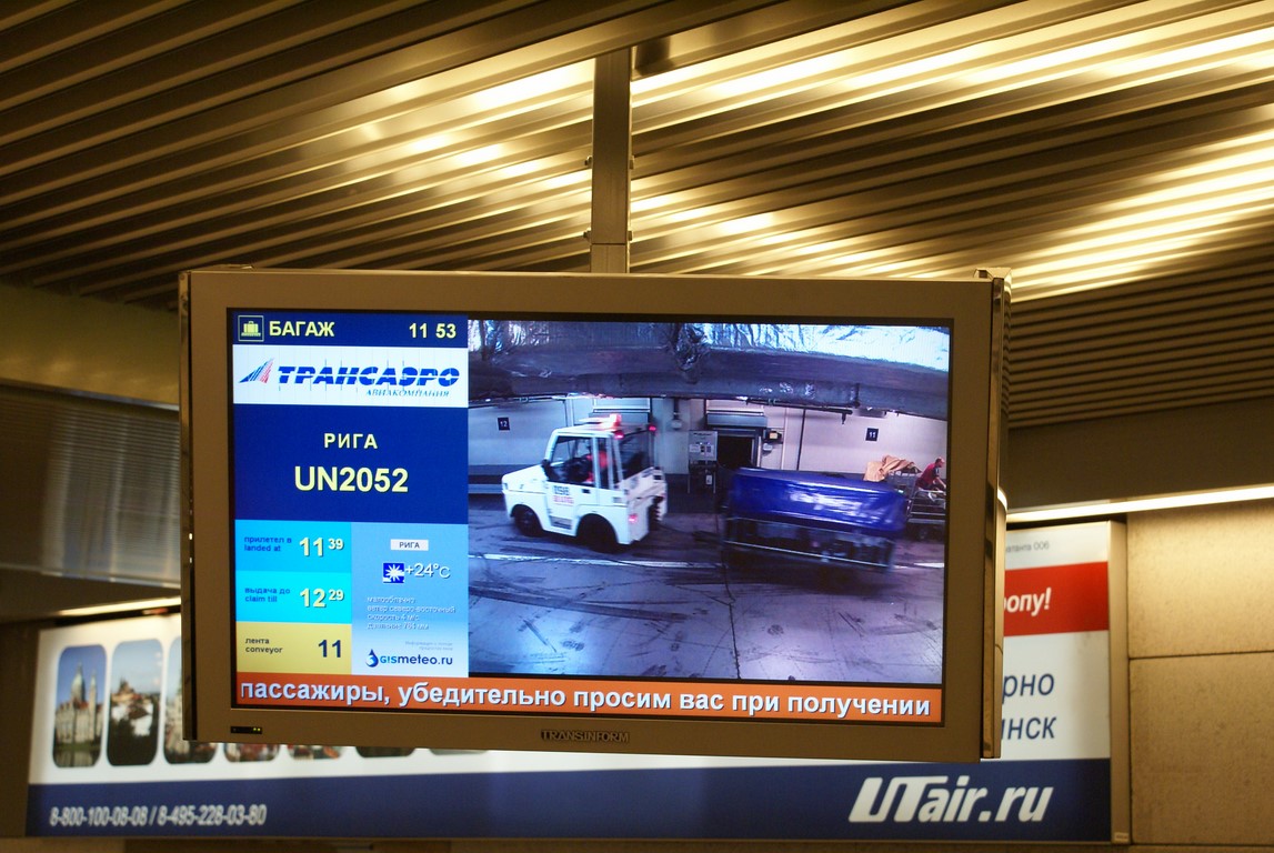 Любой прилетающий в Аэропорт Внуково пассажир теперь может увидеть весь процесс выгрузки багажа на ленточный транспортер на мониторах в зале ожидания. Трансляция текущей обстановки в зоне выгрузки багажа начинается автоматически при назначении багажной ленты на рейс.