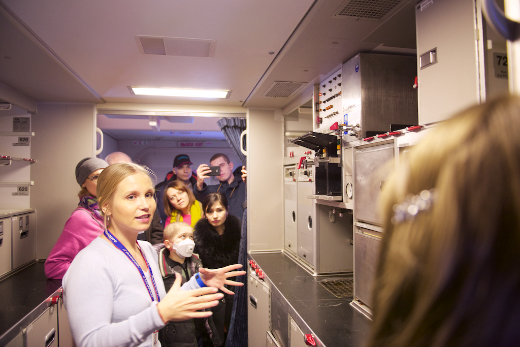 Представители авиакомпании провели экскурсию по всему самолёту, показали бортовые кухни и даже спальные места отдыха экипажа, которыми оборудован этот тип воздушного судна. Кульминацией всего мероприятия стала кабина огромного авиалайнера. Пилот-инструктор рассказал юным экскурсантам, как устроено управление самолетом, показал как прокладывается маршрут полёта. Все желающие смогли посидеть в настоящем кресле пилота и сфотографироваться в форменной фуражке командира воздушного судна авиакомпании «Трансаэро».