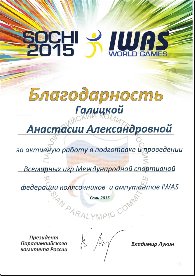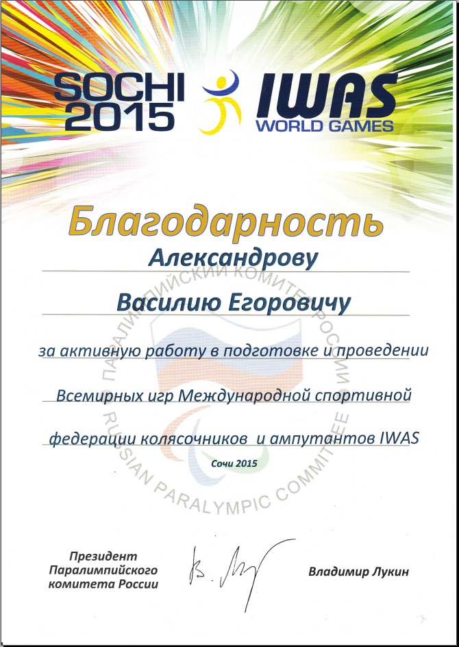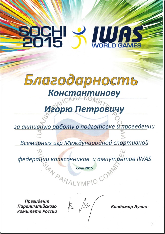 Президент Паралимпийского комитета России Владимир Петрович Лукин выразил благодарность руководству и сотрудникам аэропорта Внуково и ООО «Трансагентство Внуково» за активную работу в подготовке и проведении Всемирных игр Международной спортивной федерации колясочников и ампутантов IWAS 2015, проходивших в столице зимних Олимпийских и Паралимпийских игр 2014 года в городе Сочи.