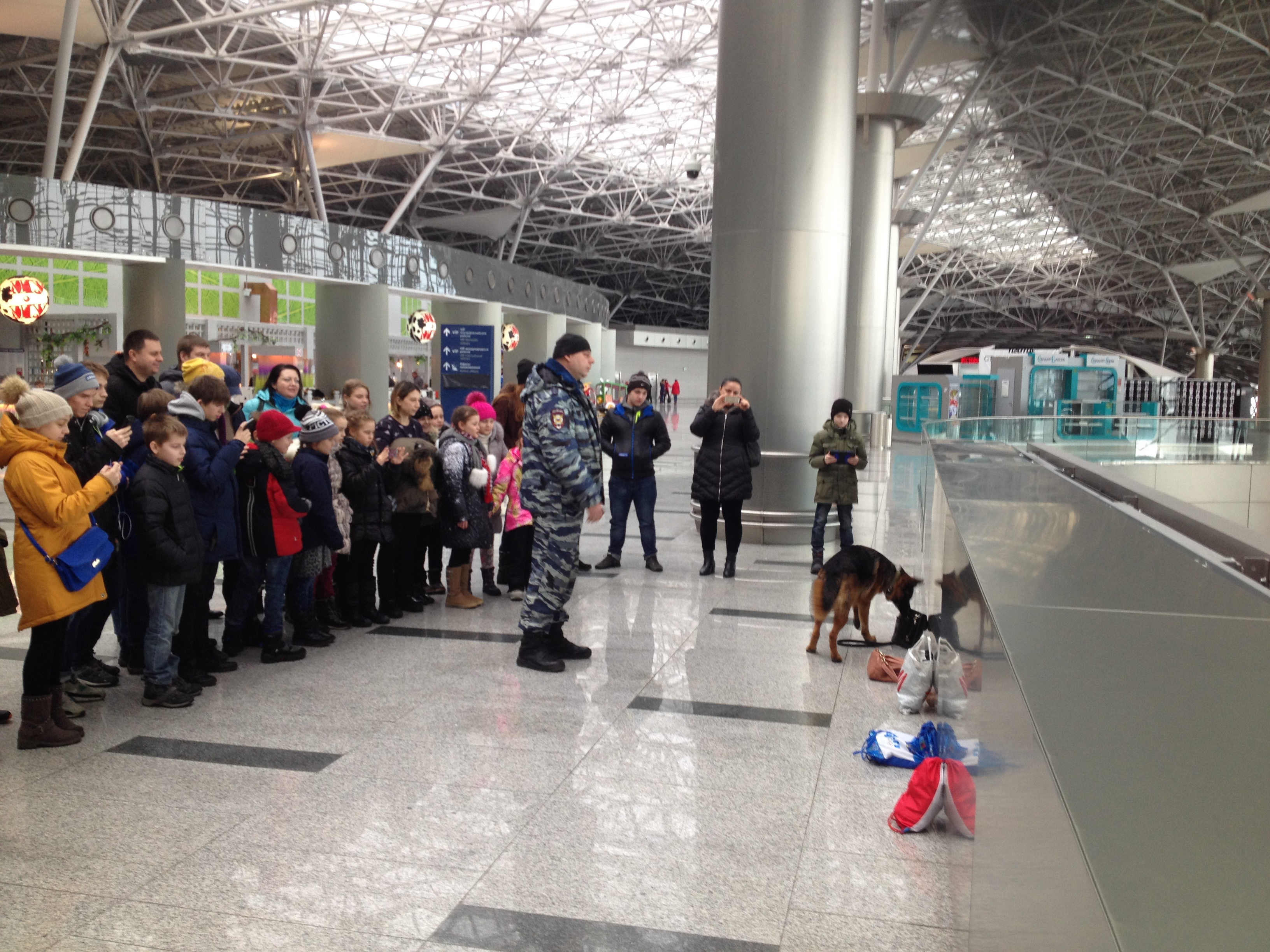 После осмотра зала регистрации ребят познакомили с кинологической службой Линейного отдела МВД в аэропорту Внуково, которая продемонстрировала работу служебных собак, натренированных на поиск взрывчатых веществ. Ежедневно четвероногие охранники обходят терминалы, багажные отделения, камеры хранения, проверяют багаж, проводят обследование бесхозных предметов, иными словами, самоотверженно стоят на страже безопасности и комфорта пассажиров.