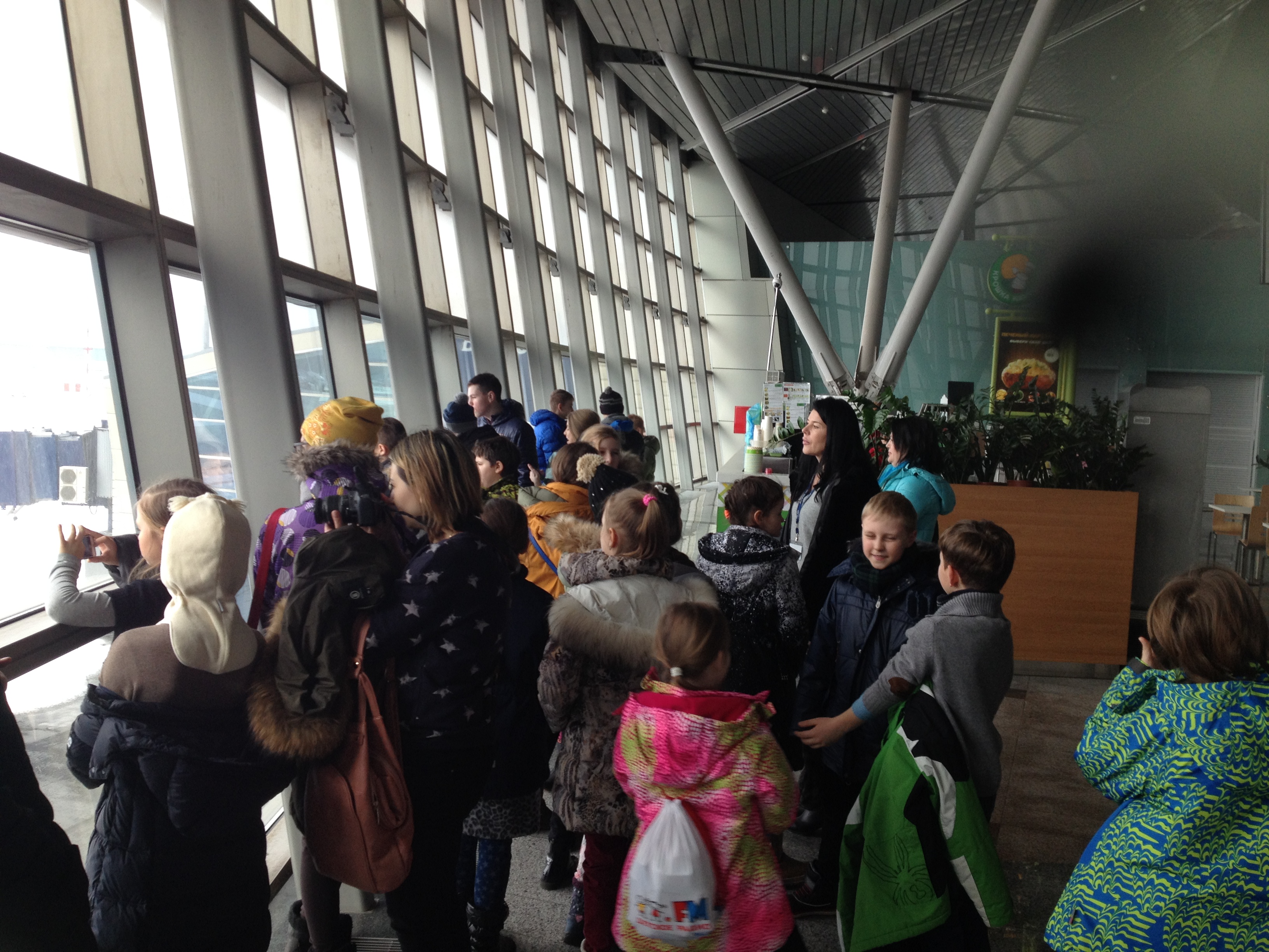 В продолжение экскурсии ребята посетили посадочную галерею внутрироссийских рейсов. Через панорамные окна терминала А была отлично видна вся работа на перроне аэропорта: буксировка воздушных судов, заправка, антиобледенительная обработка. И дети, и сопровождающие их взрослые, не отрываясь, наблюдали за процессами обслуживания воздушных судов.