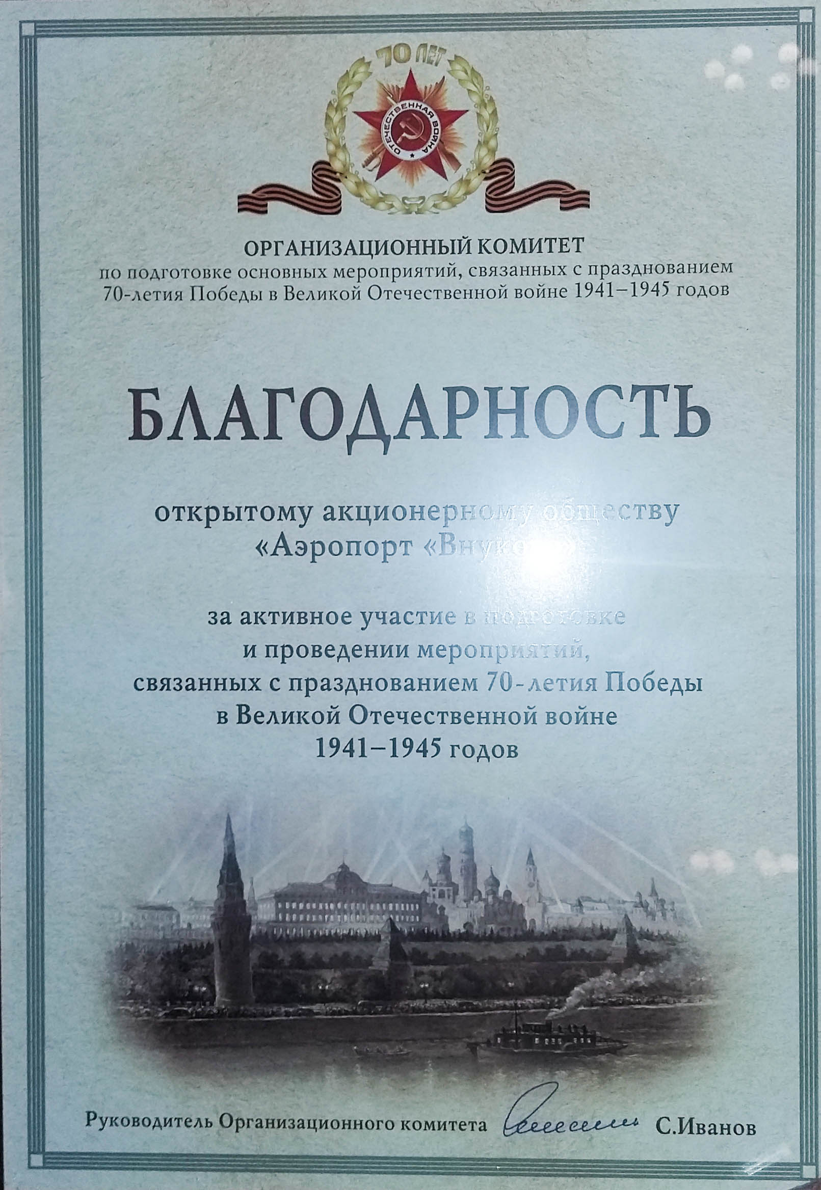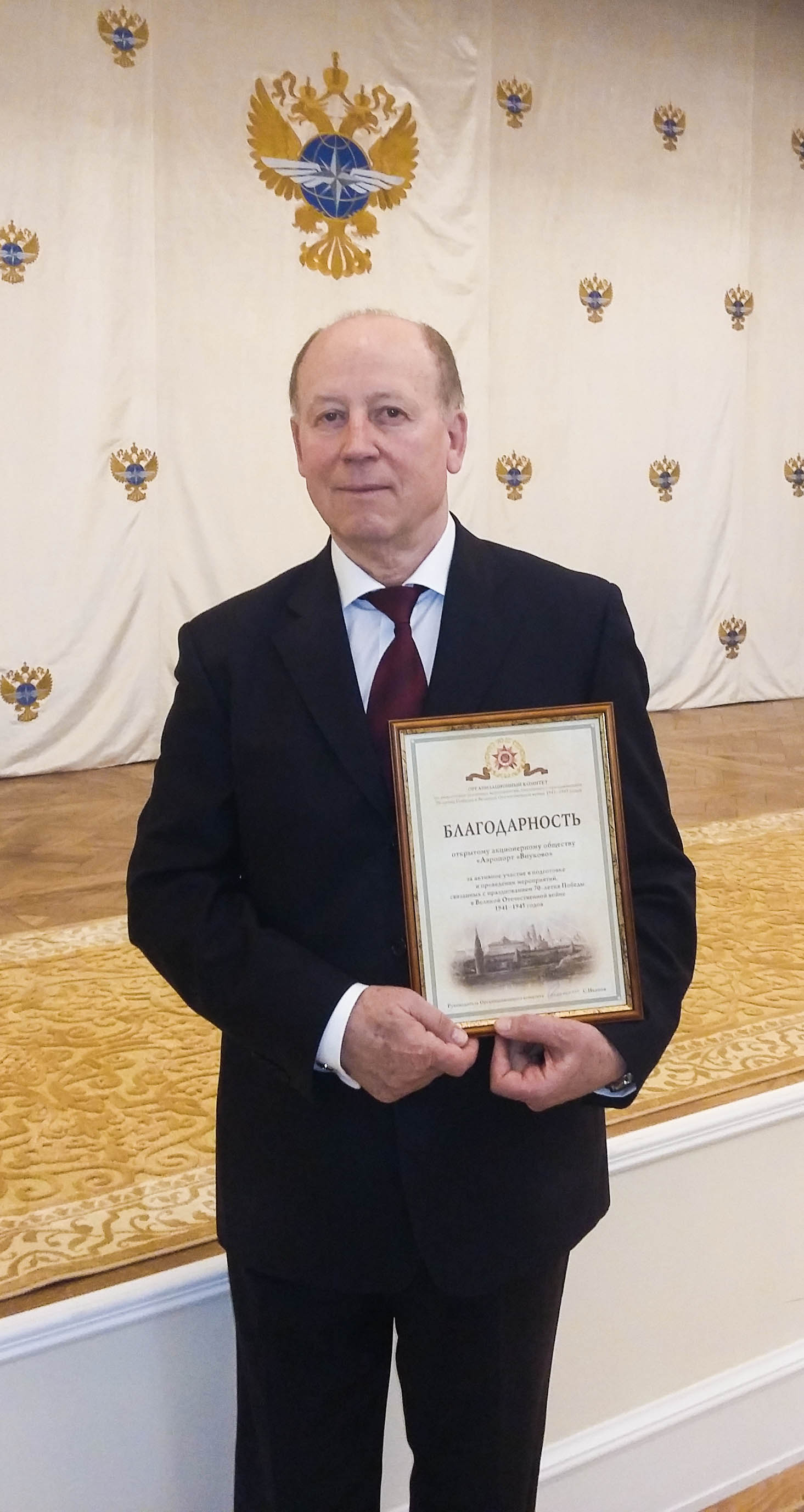 26 апреля в Гербовом зале Министерства транспорта РФ Министр транспорта Максим Соколов вручил генеральному директору АО «Аэропорт Внуково» Василию Егоровичу Александрову Благодарность «За активное участие в подготовке и проведении мероприятий, связанных с празднованием 70-летия Победы в Великой Отечественной войне 1941-1945 годов».