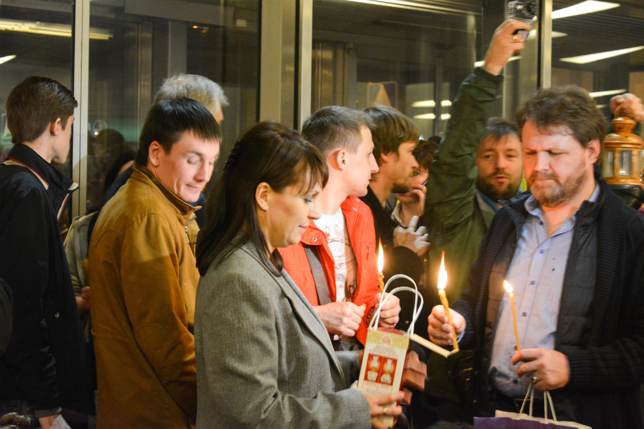 Сегодня традиционно сотни верующих встретили Благодатный огонь в аэропорту Внуково. Впервые встреча святыни прошла в терминале А.