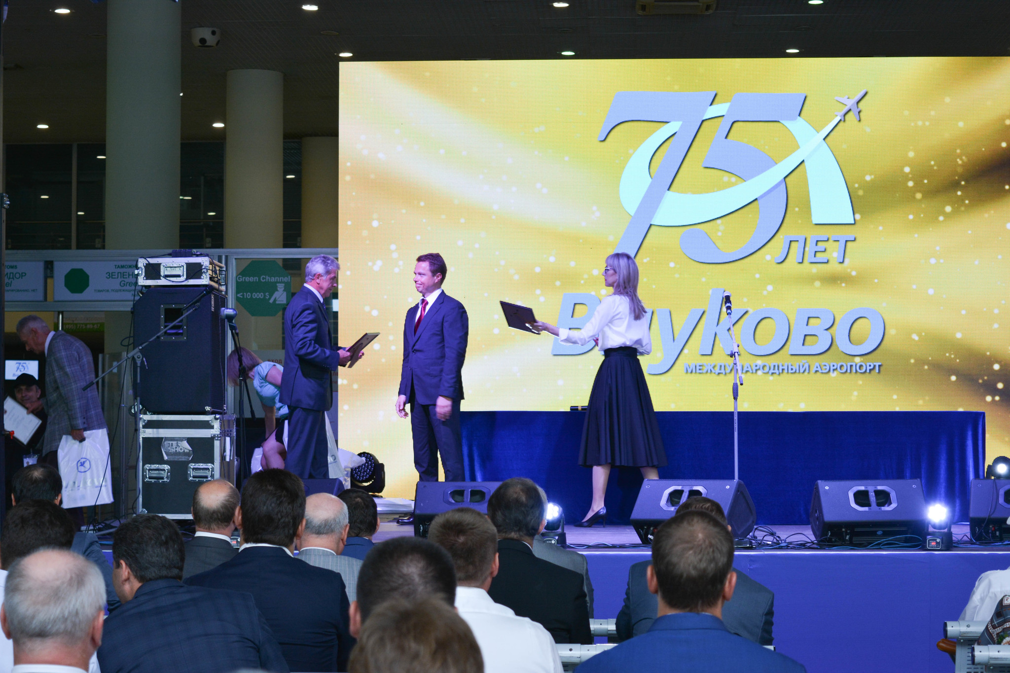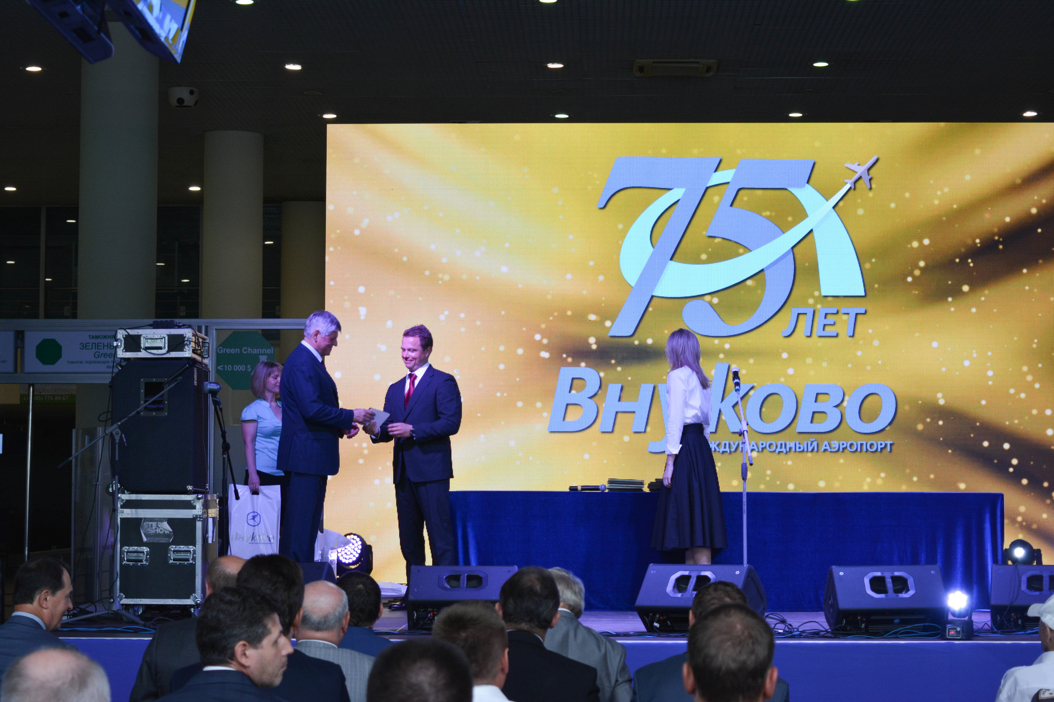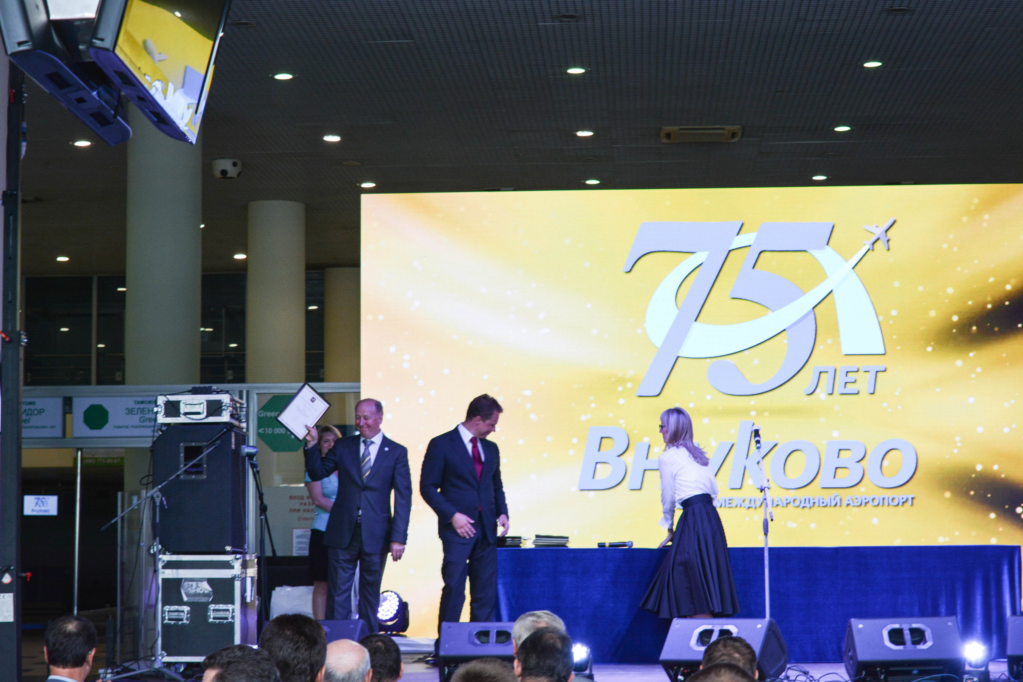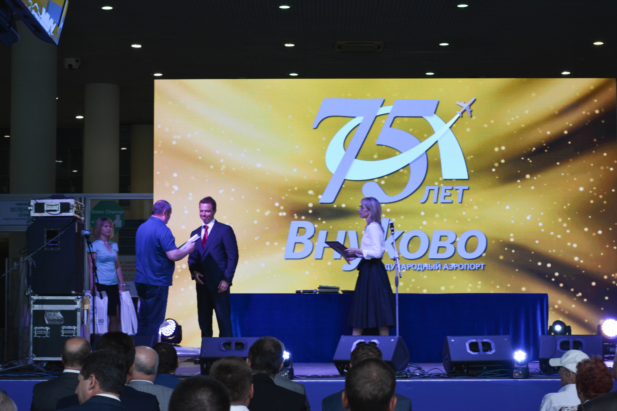 Торжественная часть началась с церемонии награждения работников аэропорта Внуково и Внуковского авиаремонтного завода № 400, которому также в этом году исполнилось 75 лет. Сотрудники получили награды Министерства транспорта Российской Федерации: нагрудные знаки «Почетный работник транспорта России» за достигнутые трудовые успехи и многолетнюю добросовестную работу на воздушном транспорте, нагрудные знаки «Отличник воздушного транспорта», почетные грамоты Министерства транспорта РФ, благодарности министра транспорта РФ, благодарности федерального агентства воздушного транспорта, награды Мэра Москвы.