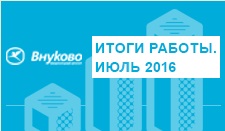 В июле 2016 года в Международном аэропорту Внуково было обеспечено обслуживание 14 625 рейсов и 1 млн 593 тыс. пассажиров. Пассажиропоток на внутренних воздушных линиях составил 1 млн 184 тыс. пассажиров, на международных воздушных линиях 409 тыс. пассажиров.