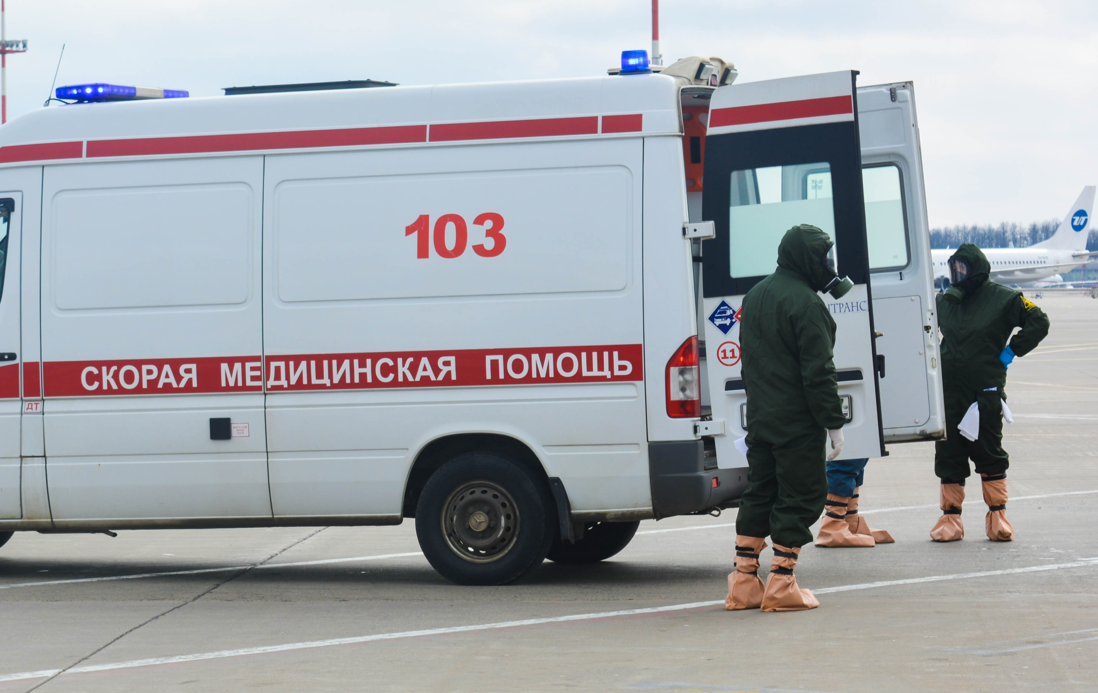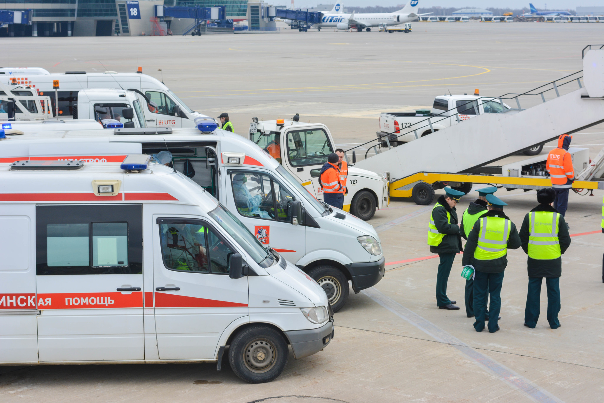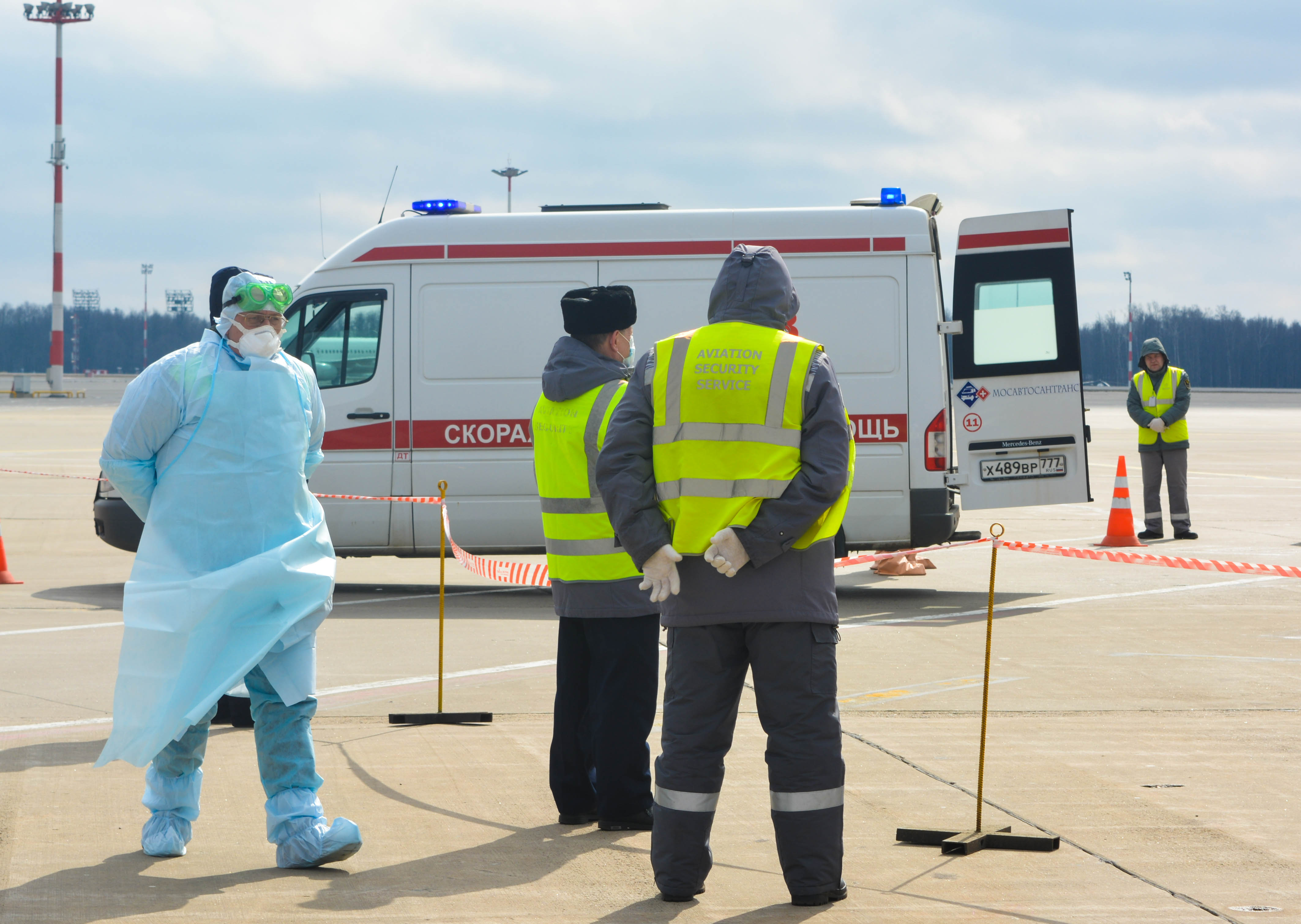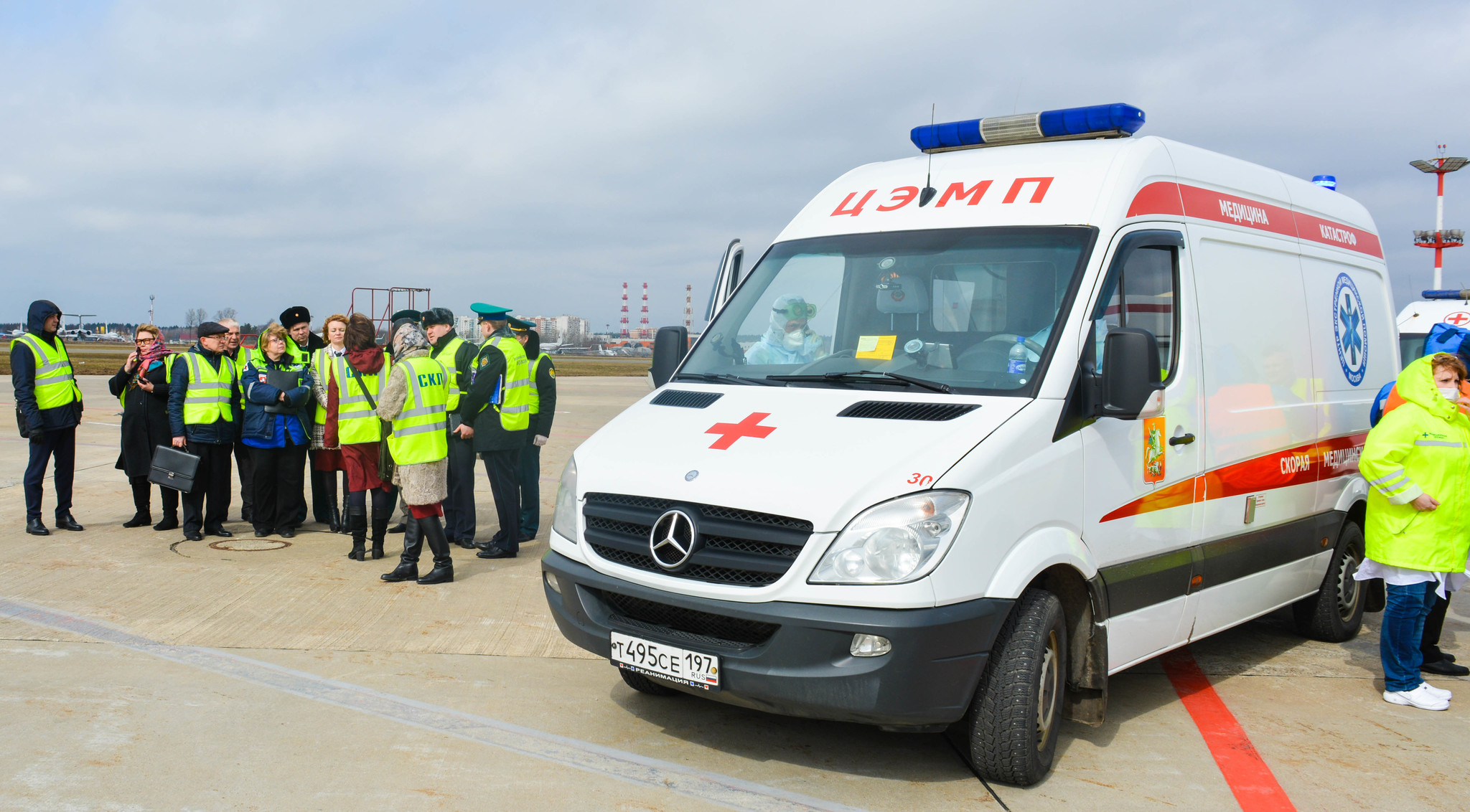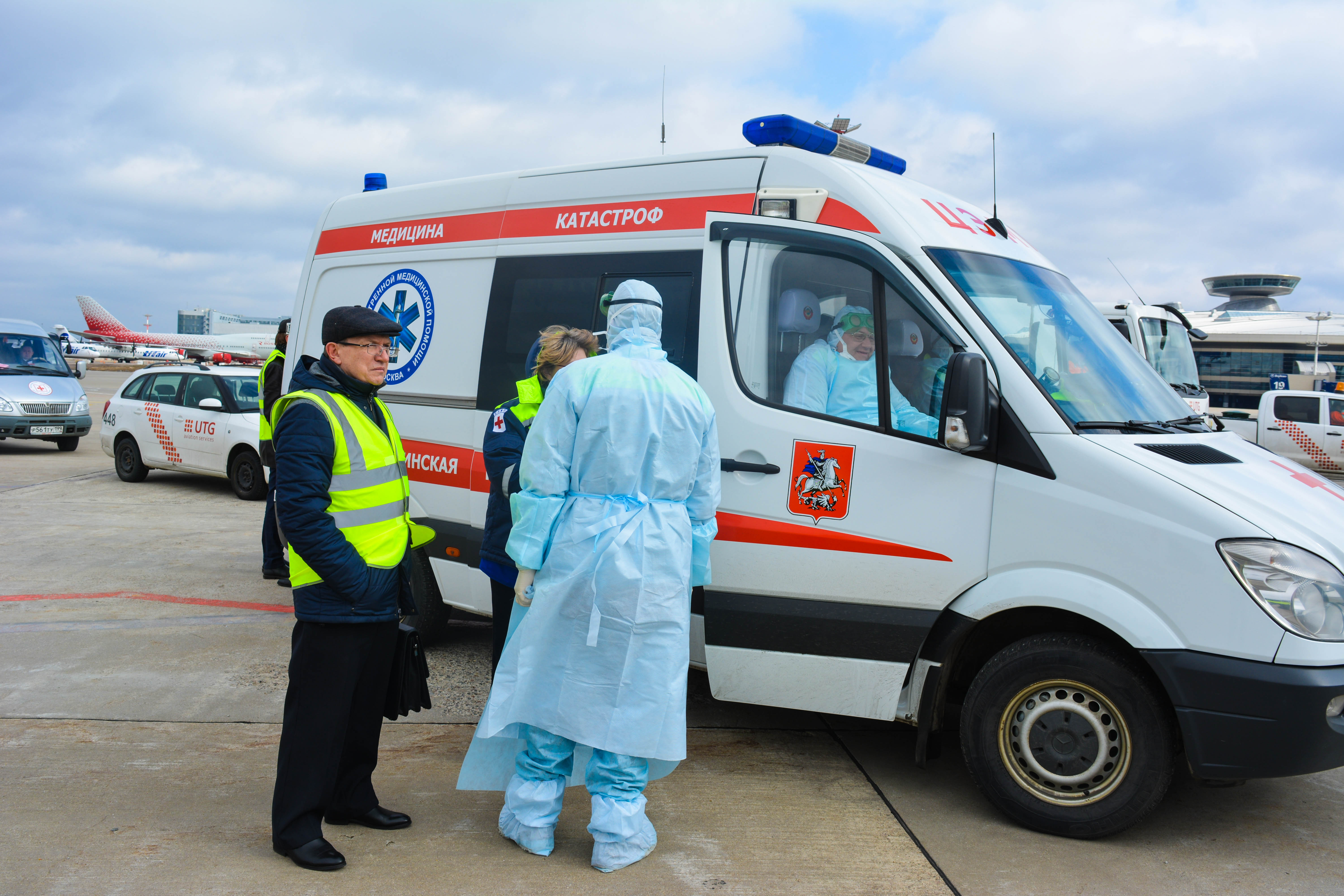 К моменту посадки борта на санитарной стоянке уже находились машины скорой неотложной помощи, сотрудники СКП и врачи здравпункта аэровокзального комплекса Внуково, облачённые в защитные костюмы, место стоянки было оцеплено и выставлен пост охраны.
