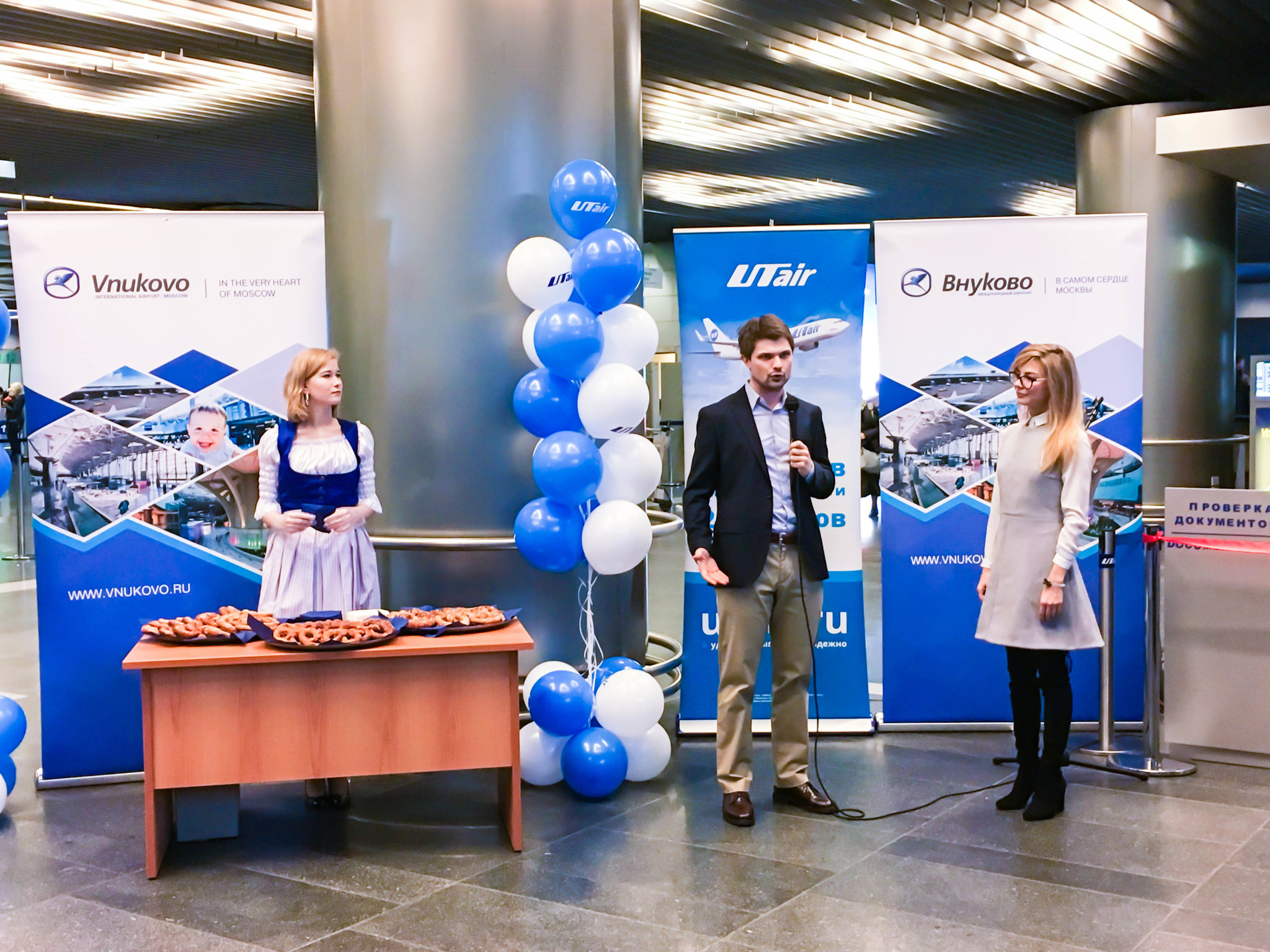 В честь торжественного открытия нового направления пассажиров первого рейса ждали приятные сюрпризы – национальные баварские угощения и карты бонусной программы UTair STATUS уровня SILVER. При этом первым 5 путешественникам, купившим билеты на рейс Москва – Мюнхен, авиакомпания вручила карты уровня GOLD. Кроме того, первый пассажир, зарегистрировавшийся на рейс, получил набор памятных подарков от Международного аэропорта Внуково.