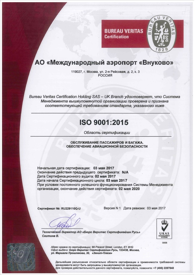 Международный аэропорт Внуково получил сертификат соответствия требованиям международного стандарта ISO 9001:2015. Сертификат удостоверяет соответствие Системы Менеджмента Качества компании и ее производственных процессов лучшим международным практикам.