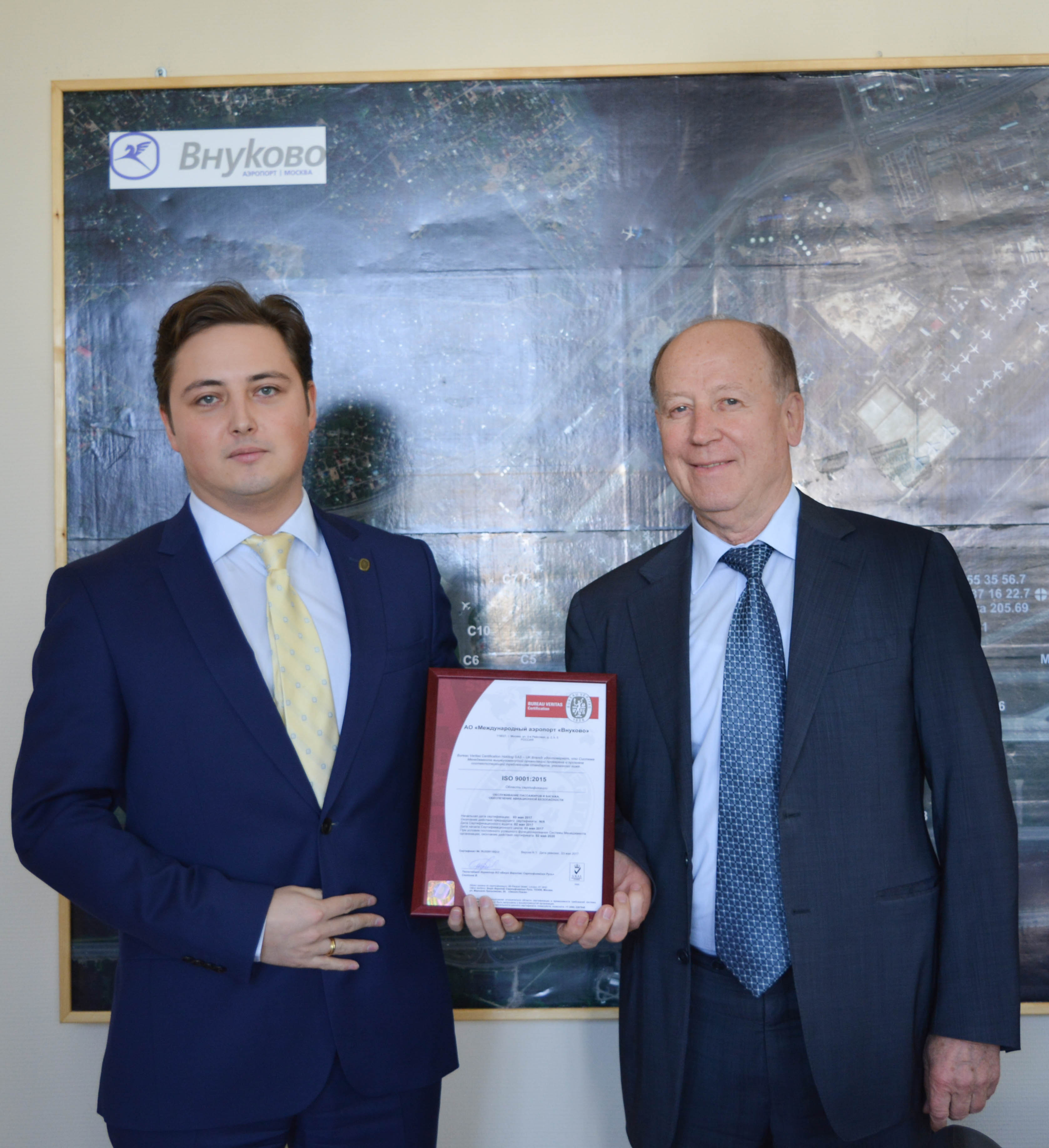 Торжественное вручение сертификата генеральному директору АО «Международный аэропорт «Внуково» Александрову Василию Егоровичу состоялось 5 мая. Сертификат вручал директор по сертификации АО «Бюро Веритас Сертификейшн Русь» Шипилов Евгений Дмитриевич.