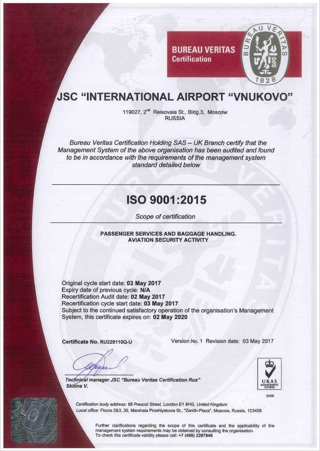 Аудит проведен органом по сертификации Bureau Veritas, мировым лидером в области испытаний, инспекций и сертификации. Областью сертификации стало обслуживание пассажиров и багажа, а также обеспечение авиационной безопасности.