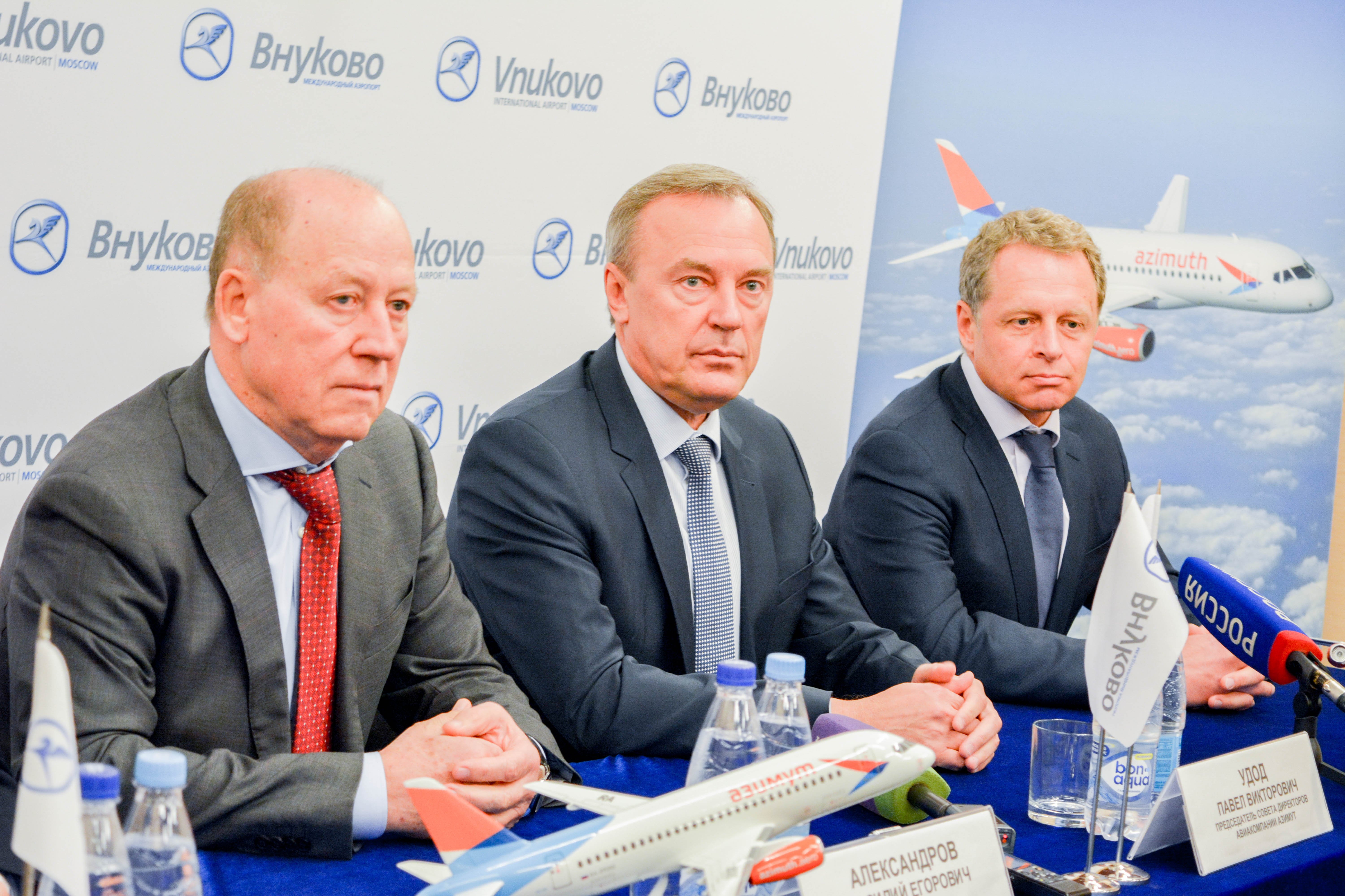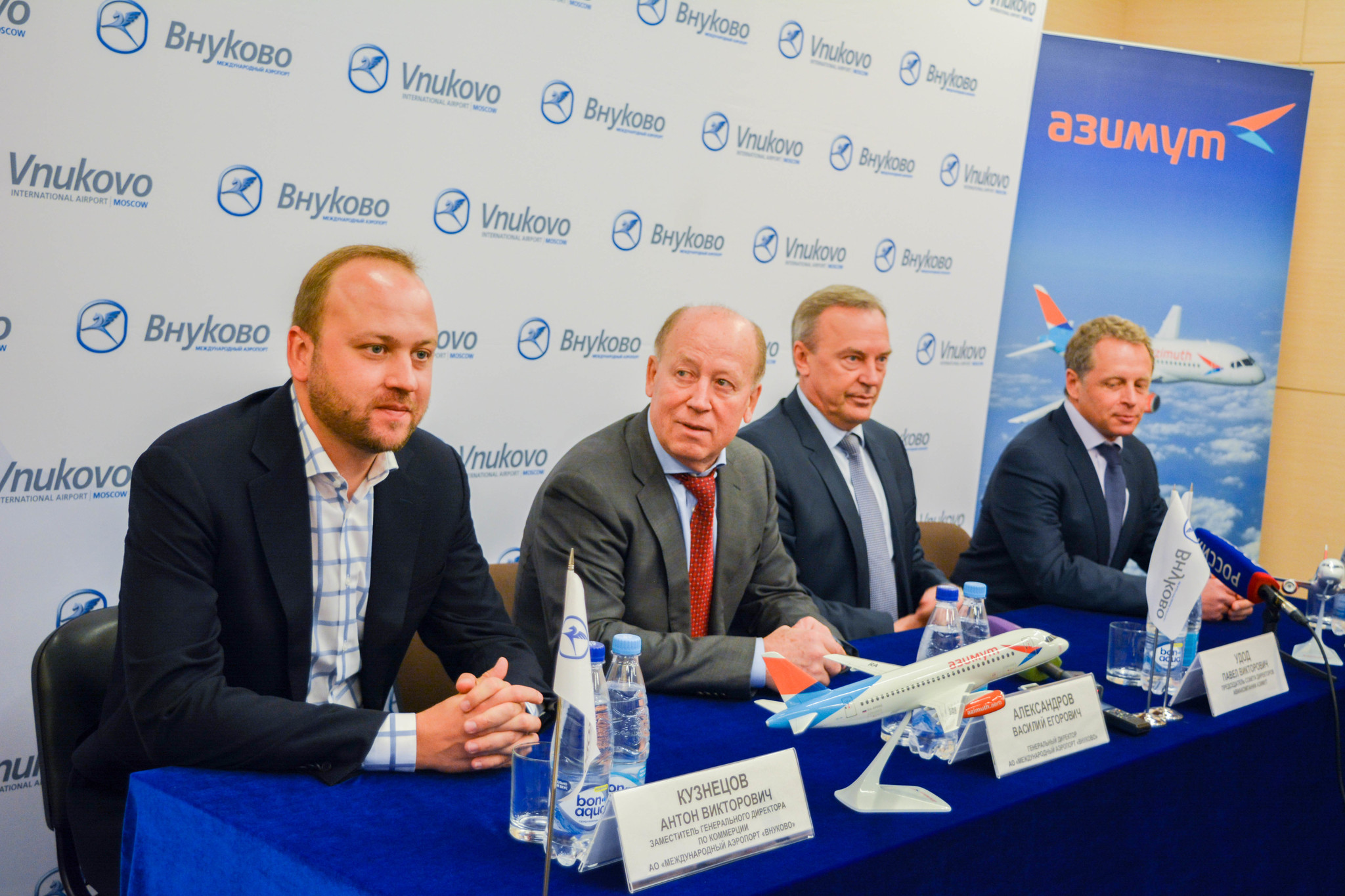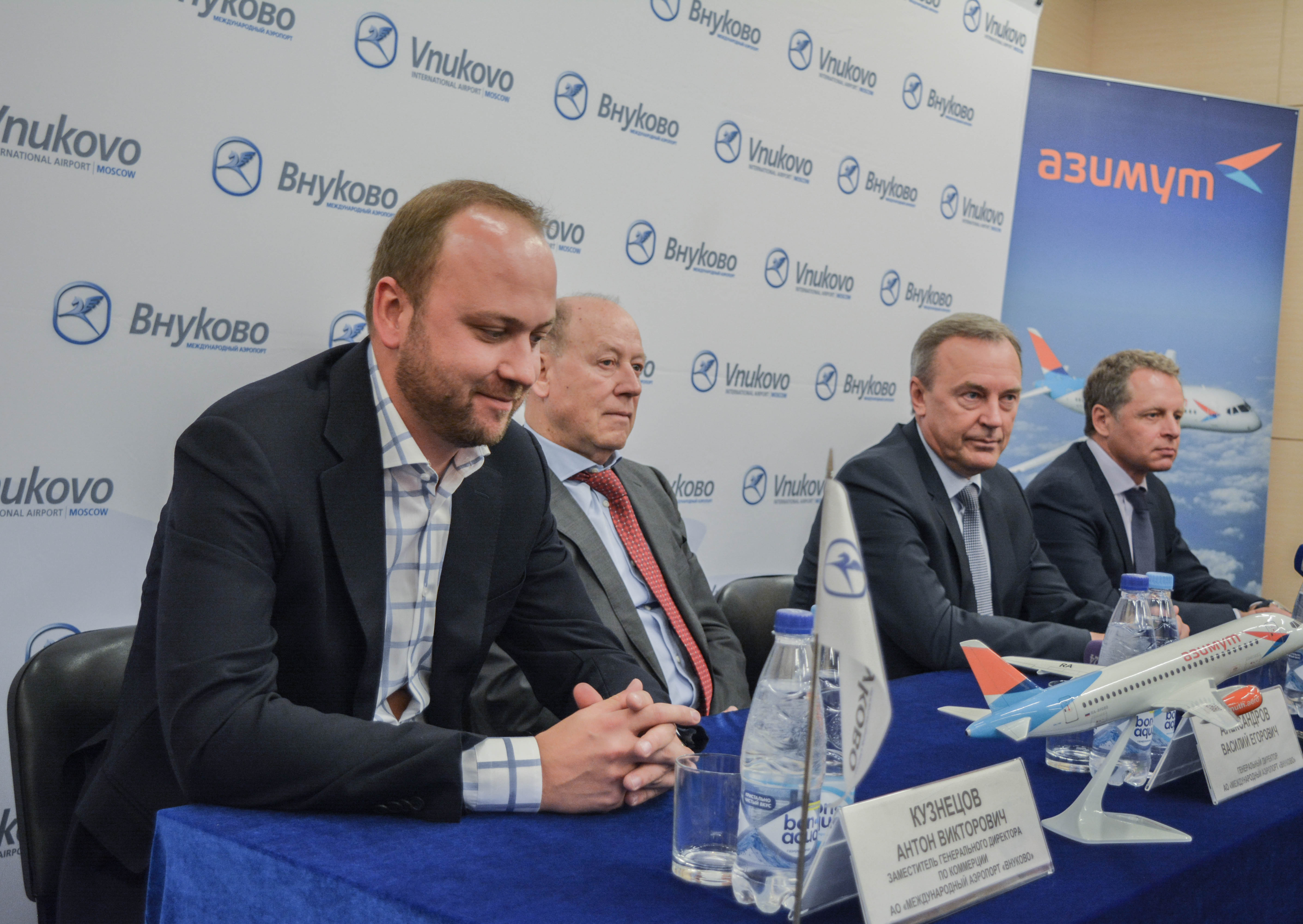 В рамках торжественного мероприятия открытия полетов авиакомпании «Азимут» в терминале А Международного аэропорта Внуково прошла пресс-конференция, в которой приняли участие генеральный директор АО «Международный аэропорт «Внуково» Александров Василий Егорович, заместитель генерального директора по коммерции аэропорта Внуково Антон Викторович Кузнецов, председатель Совета директоров авиакомпании «Азимут» Удод Павел Викторович и генеральный директор авиакомпании Екжанов Павел Александрович. Все выступившие отметили важность нового партнерства и выразили уверенность в долгосрочном и успешном сотрудничестве между аэропортом и авиакомпанией.