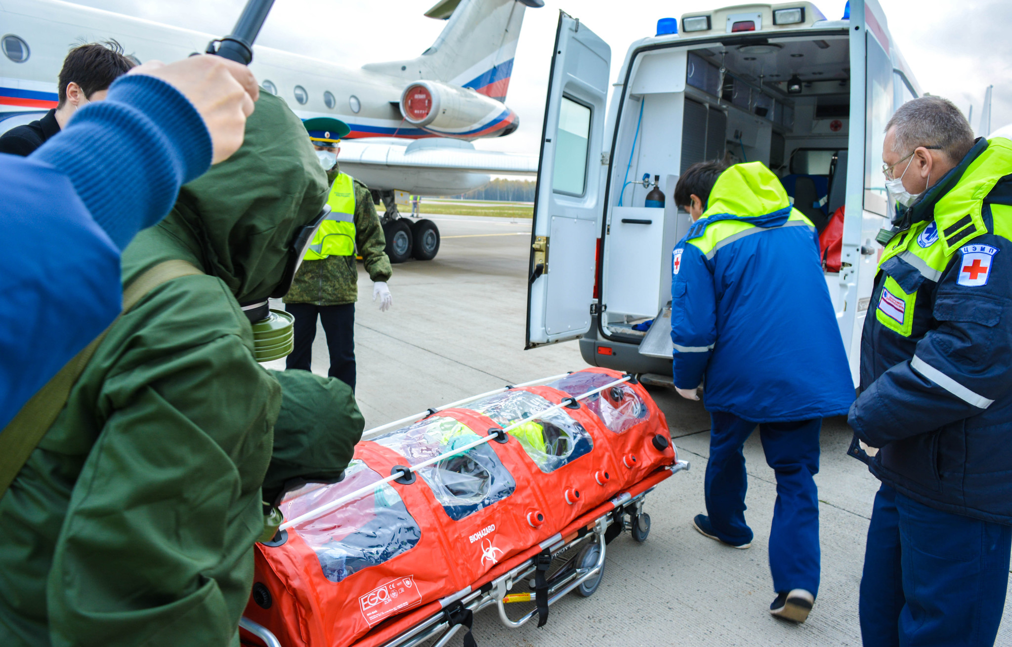 К моменту посадки борта на санитарной стоянке уже находились машины скорой неотложной помощи, сотрудники СКП и врачи здравпункта аэропорта Внуково, облачённые в защитные костюмы, место стоянки было оцеплено и выставлен пост охраны.