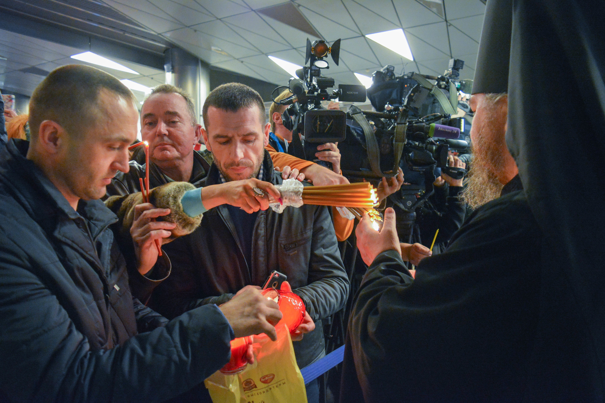 За несколько часов до прибытия рейса в аэропорту Внуково собрались представители епархий Русской Православной Церкви, а также все желающие прикоснуться к святыне. Получить Благодатный огонь со Святой земли смогли и пассажиры, оказавшиеся в момент встречи делегации из Иерусалима в терминале А.