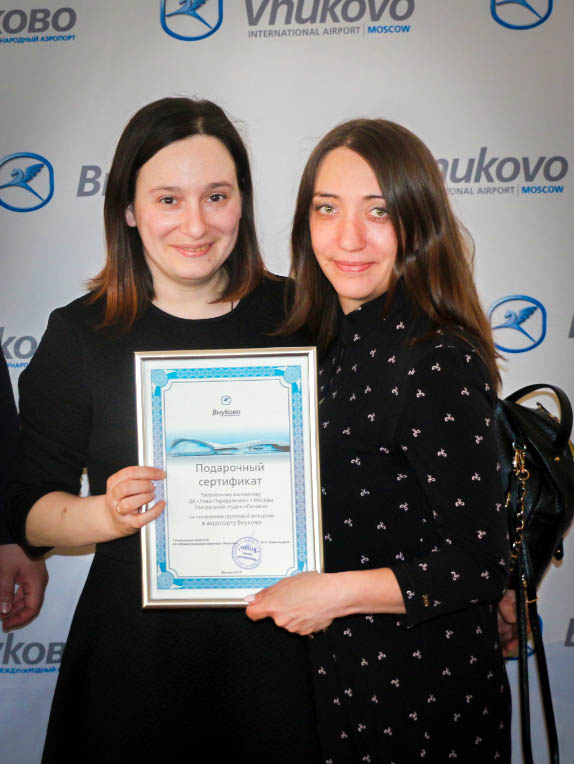Театральная студия «Личики» уже не первый раз оказывает содействие в проведении мероприятий для детей сотрудников аэропорта Внуково, за их активное участие и творческий вклад в развитие наших детей участникам театральной студии «Личики» вручили сертификат на проведение групповой экскурсии в Международном аэропорту Внуково.