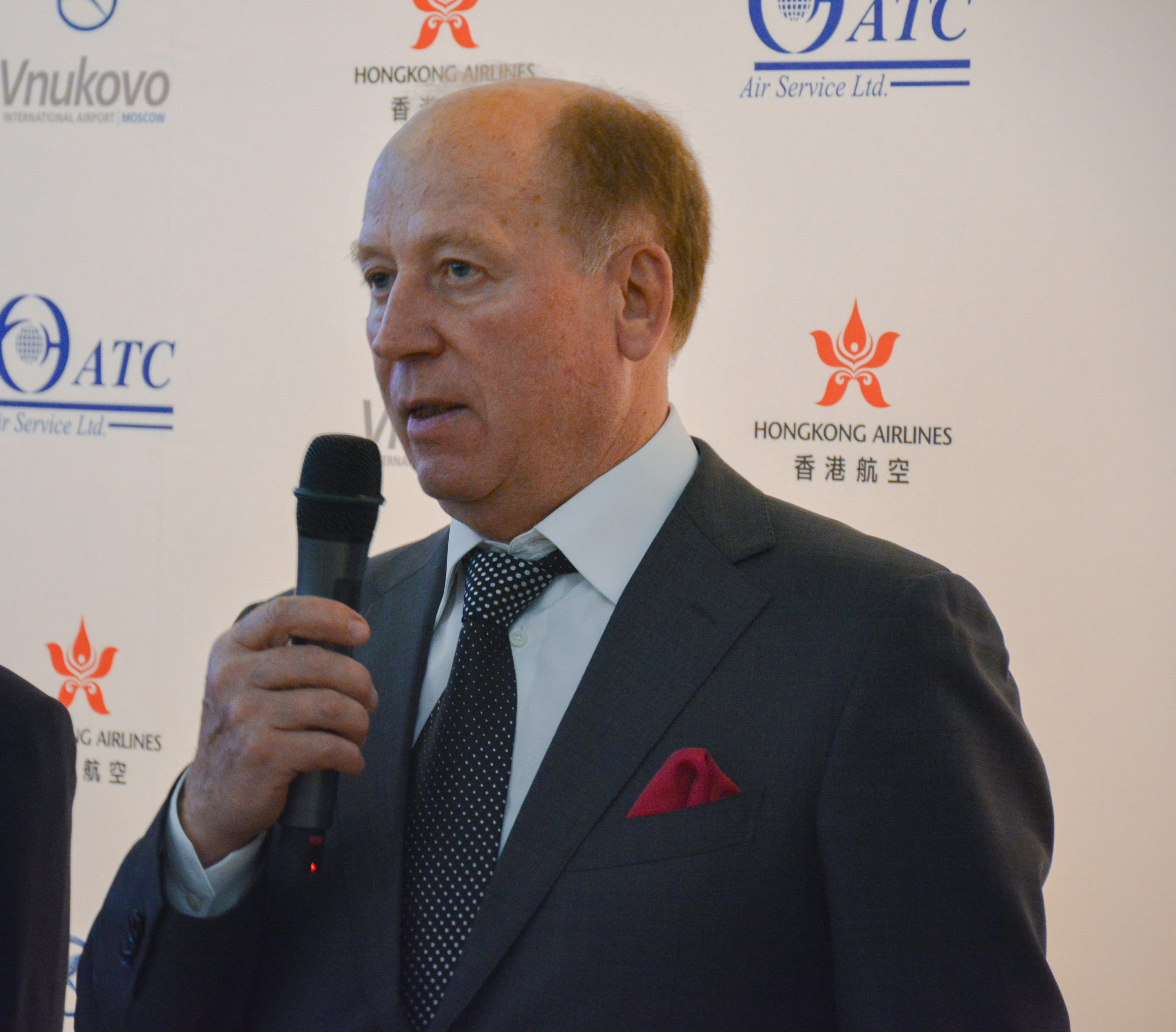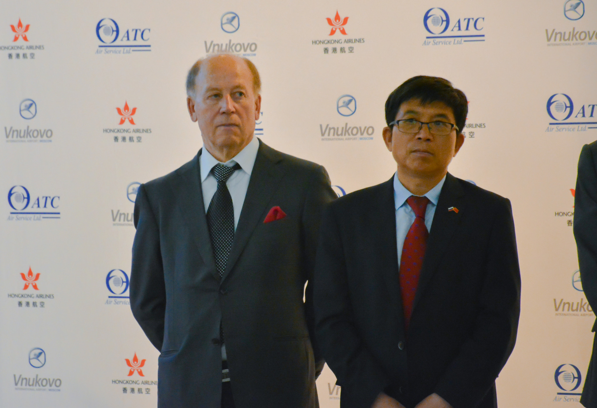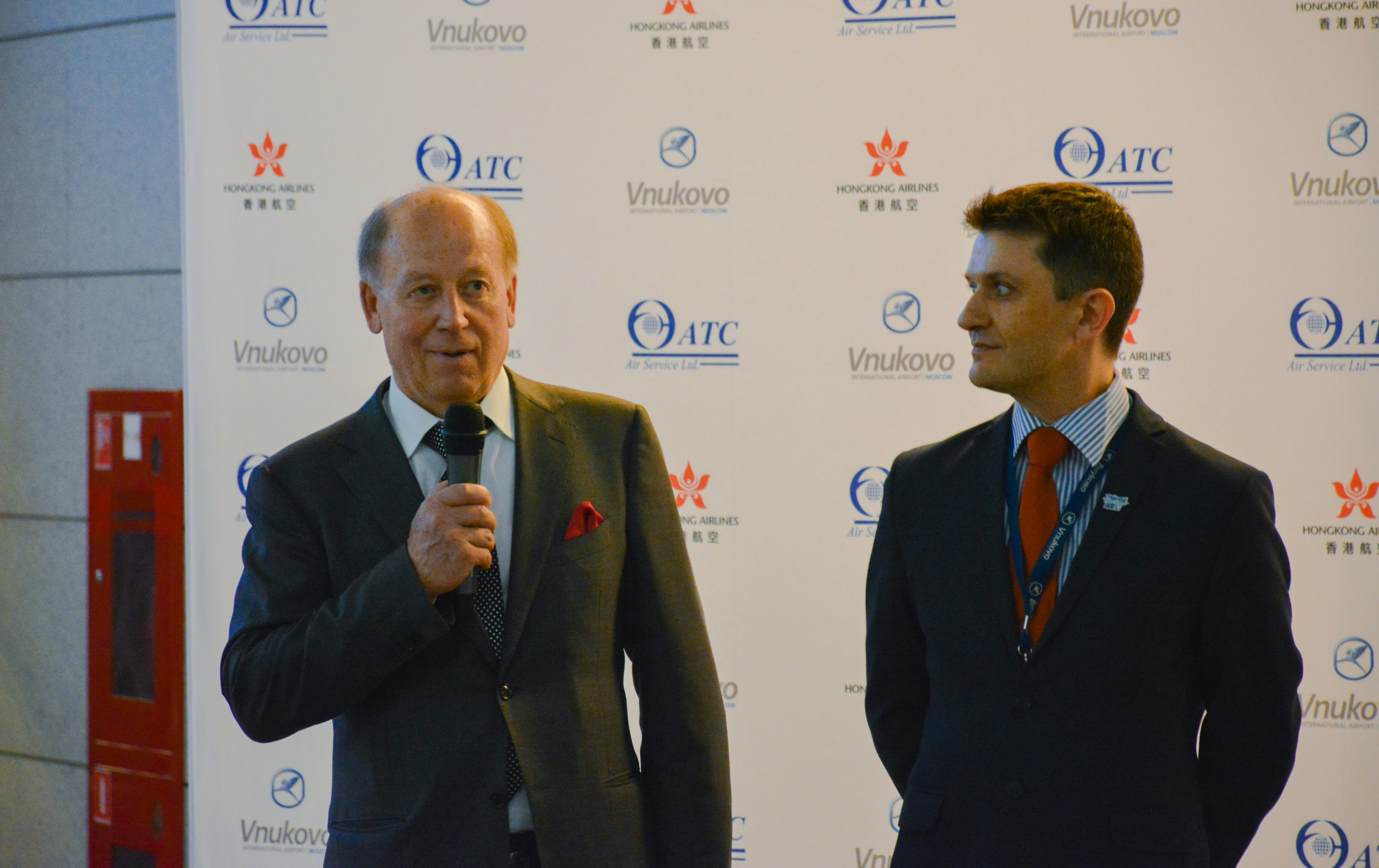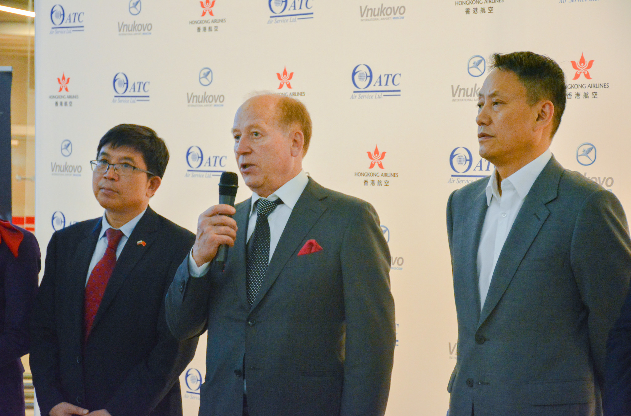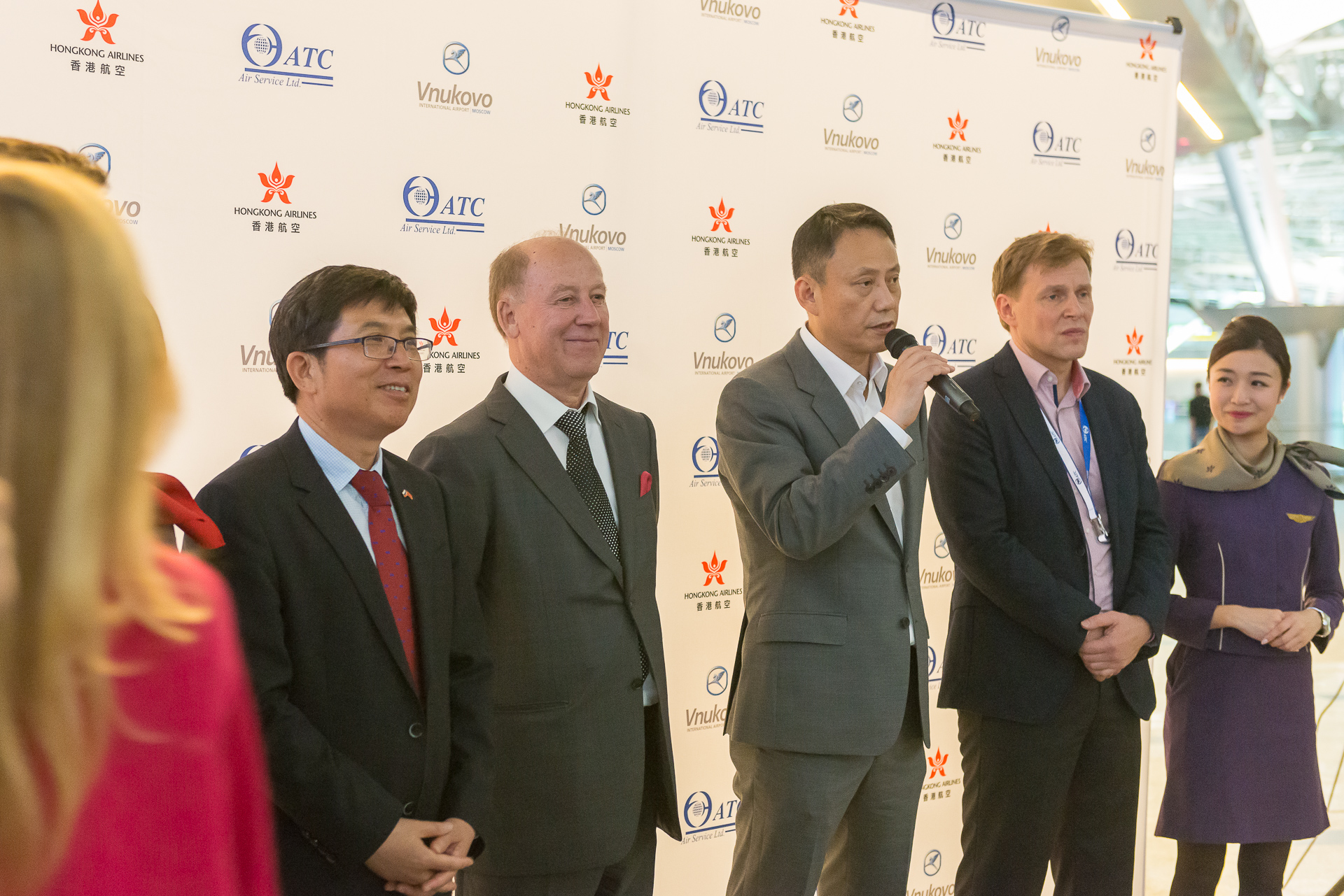 С приветственным словом выступил Генеральный директор аэропорта Внуково Василий Егорович Александров. В своем выступлении он отметил, что Hong Kong Airlines - это первый китайский авиаперевозчик, который начал выполнять рейсы в аэропорт Внуково. Также он добавил, что аэропорт Внуково готов обеспечить авиакомпании Hong Kong Airlines и пассажирам наивысшее качество обслуживания, а также лучшие трансферные возможности среди аэропортов московского авиационного узла. Василий Егорович Александров выразил уверенность, что партнерство аэропорта Внуково и авиакомпании Hong Kong Airlines будет успешным и будет развиваться максимально плодотворно.