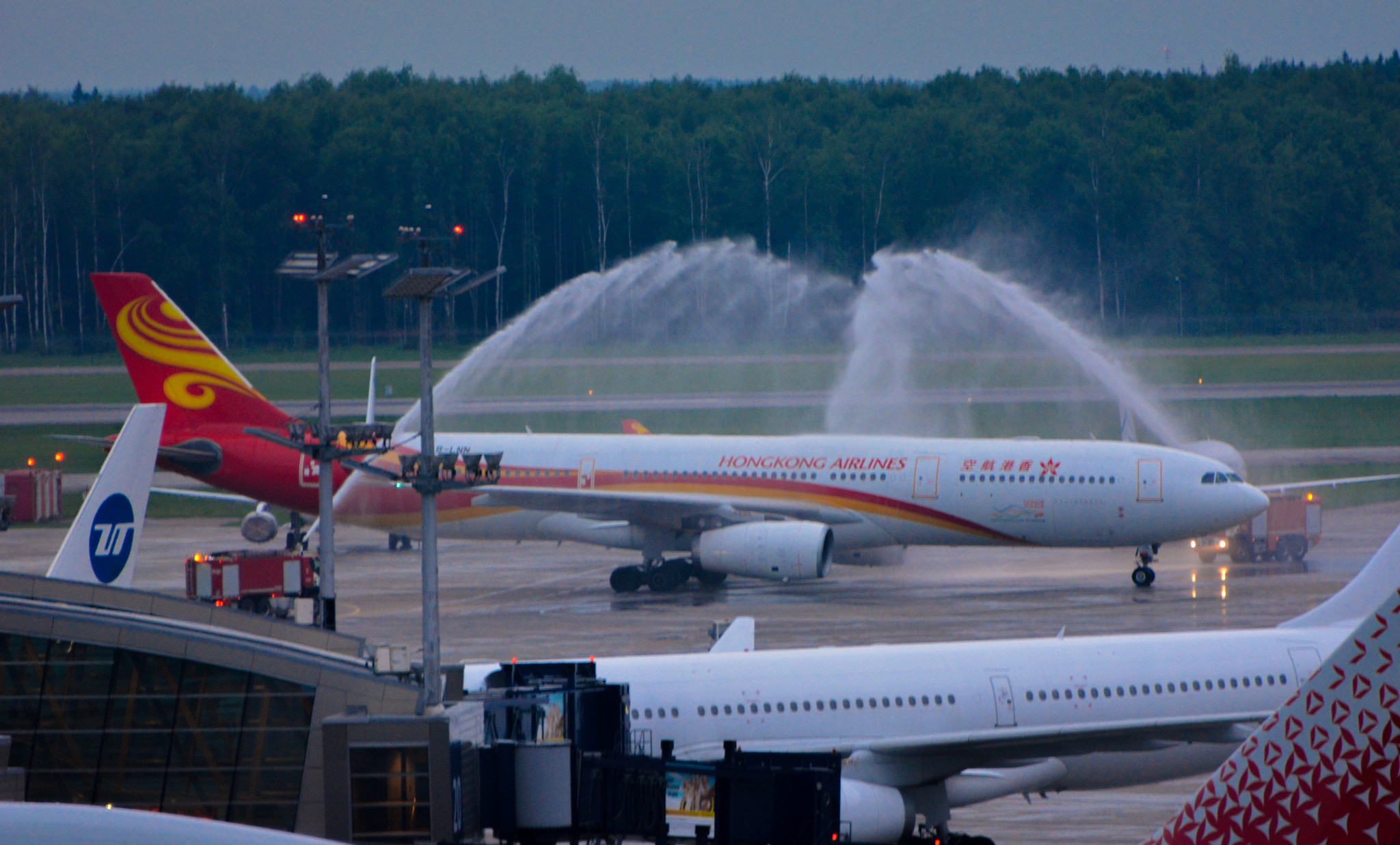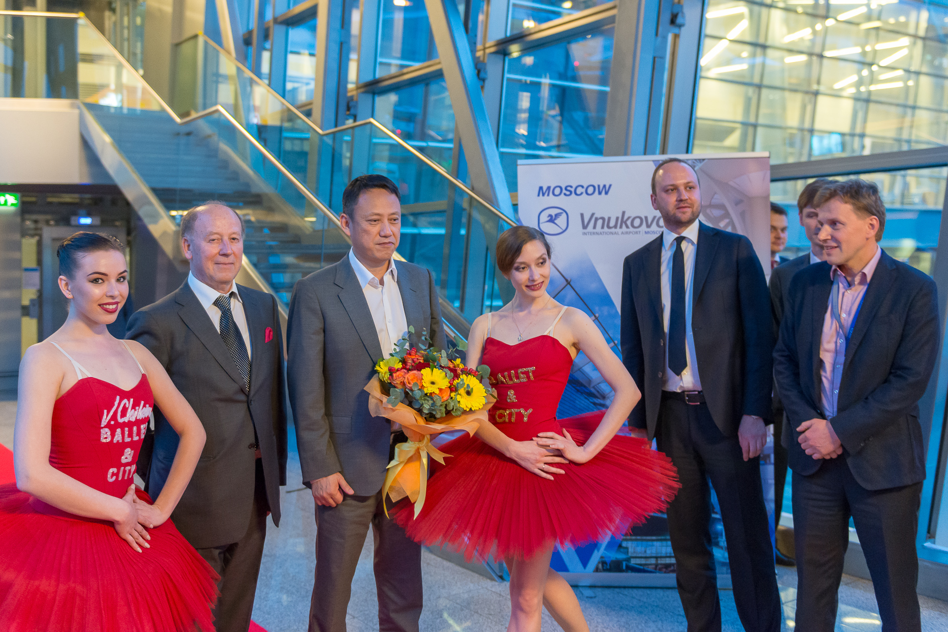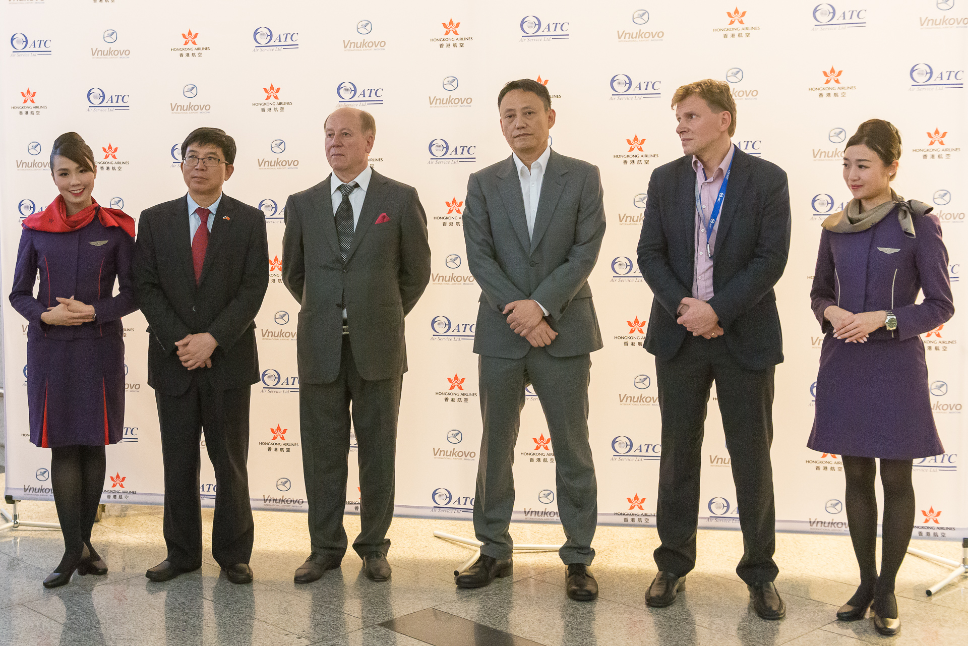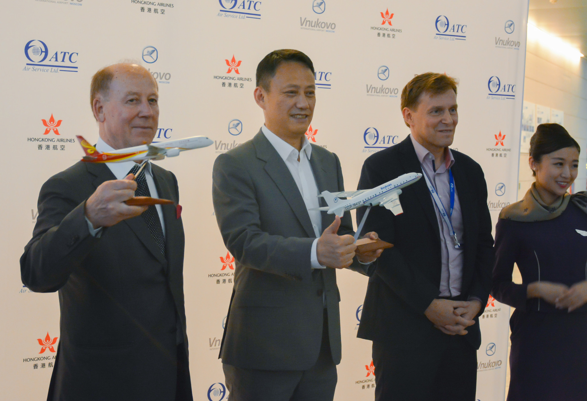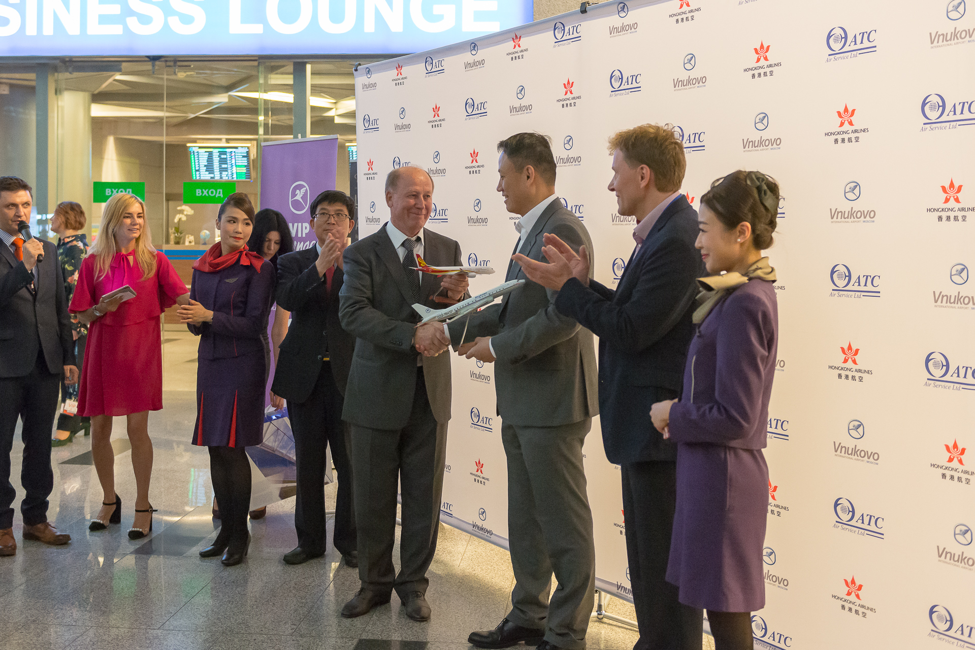 Первый борт авиакомпании Hong Kong Airlines встретили традиционной водной аркой приветствия. Кроме того, прибывших встретила делегация во главе с генеральным директором аэропорта Внуково Василием Егоровичем Александровым и Полномочным министром посольства КНР в РФ Fan Xiangzhung. В делегацию также вошли руководство аэропорта Внуково, Генеральный директор Московского офиса ATC Air Service Ltd Наталья Логунова и Представитель Хайнанских авиалиний Zhang Te. На первом рейсе прибыли Президент Hong Kong Airlines Wang Liya, Заместитель по маркетингу Zheng Fangxiang, Заместитель по развитию маршрутной сети YoHao и Руководитель отдела пассажирских перевозок принимающей компании ATC Air Service Ltd Сергей Мстиславский.