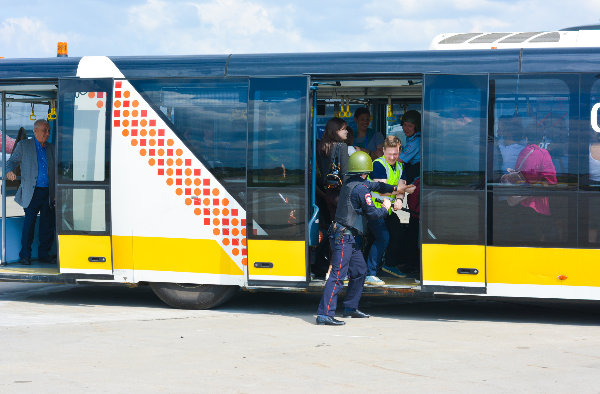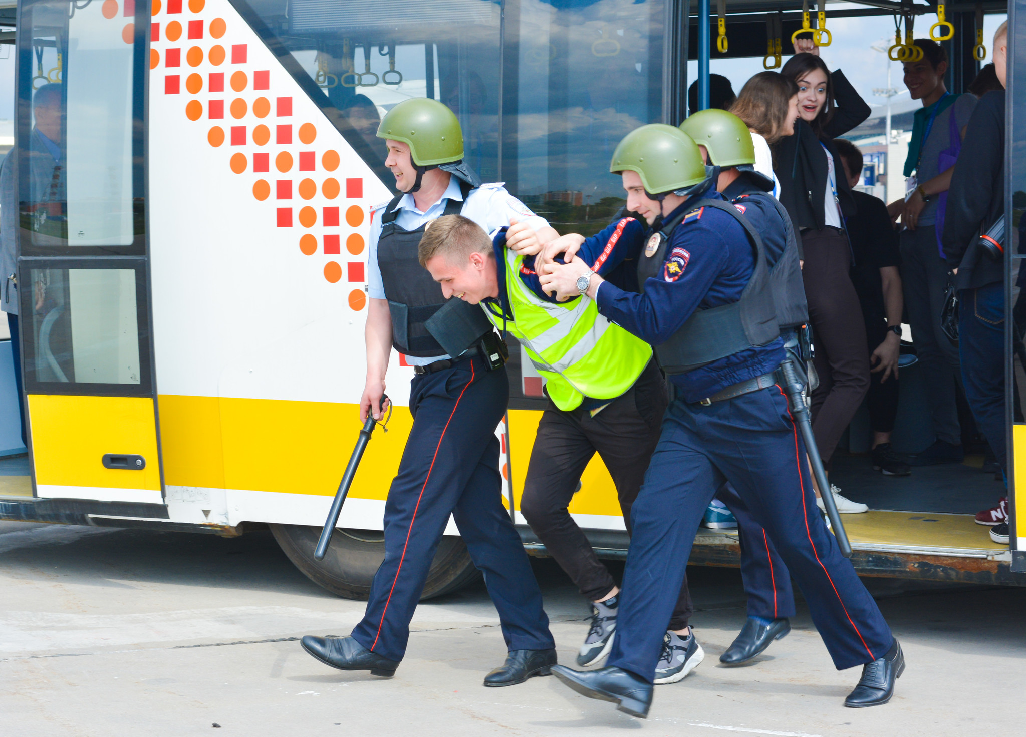 По сценарию учений при посадке в воздушное судно произошло столкновение групп болельщиков противоборствующих команд. Все участники учений успешно справились с ликвидацией группового нарушения общественного порядка.