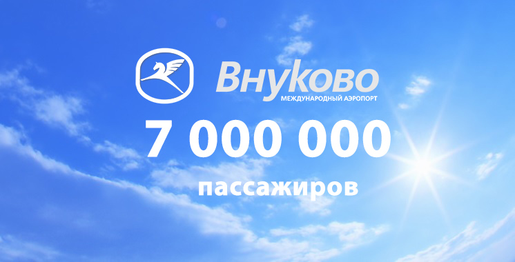 Международный аэропорт Внуково в рекордно ранний период года обслужил 7-миллионного пассажира, что на 20,4% или 1 млн 190 тыс. пассажиров больше, чем в прошлом году.
